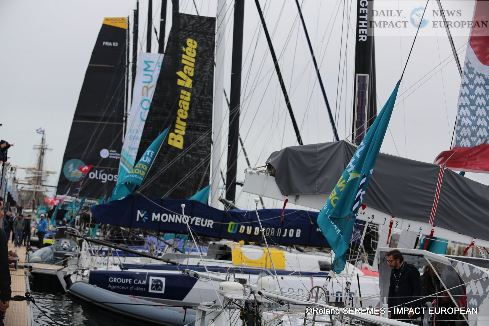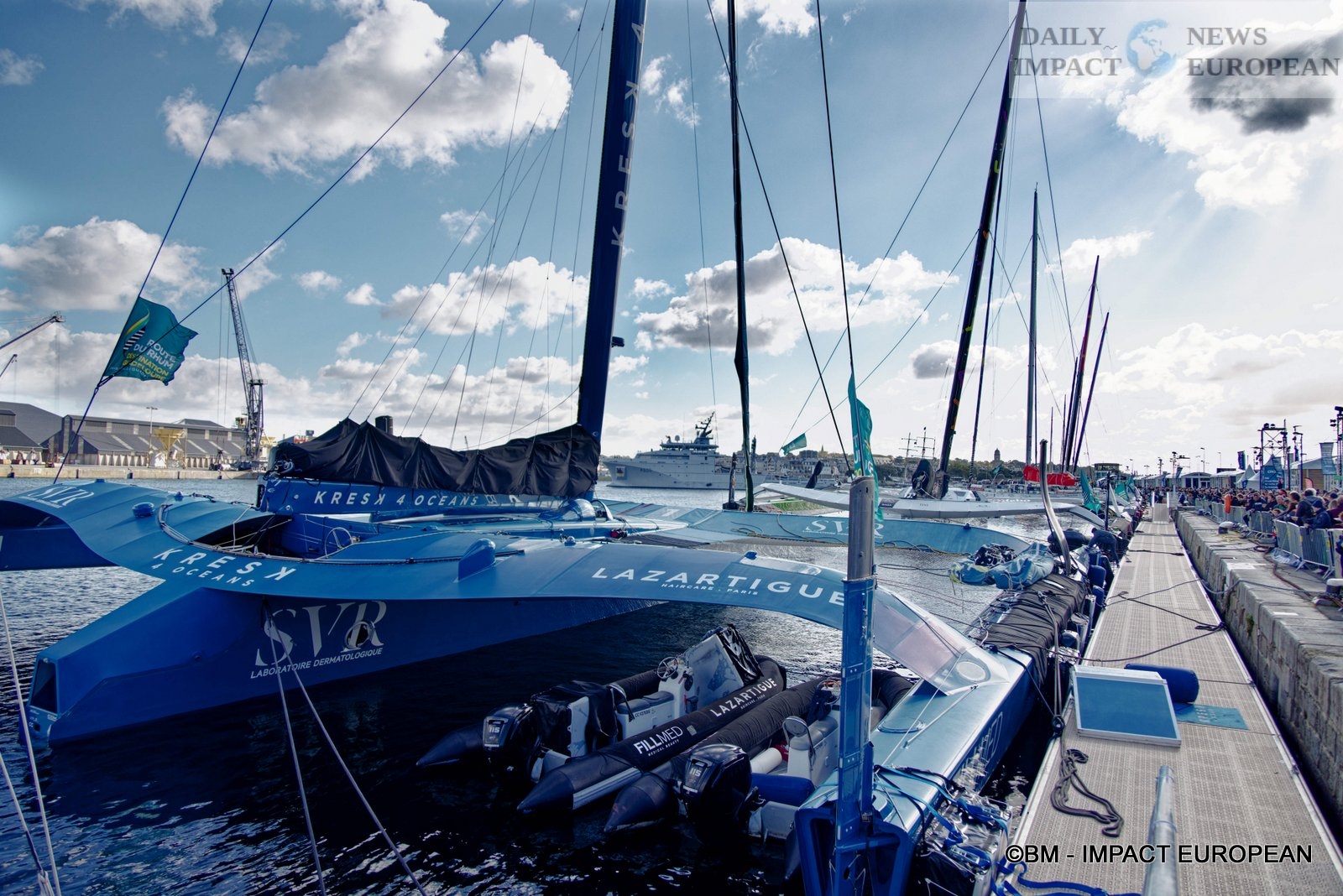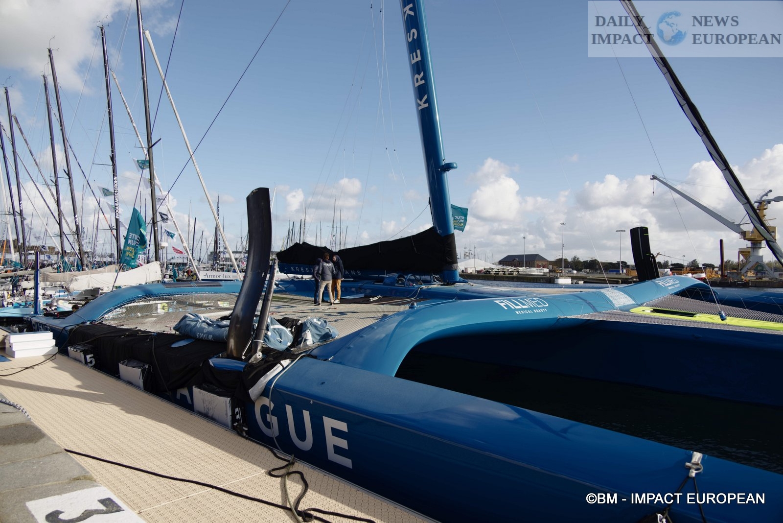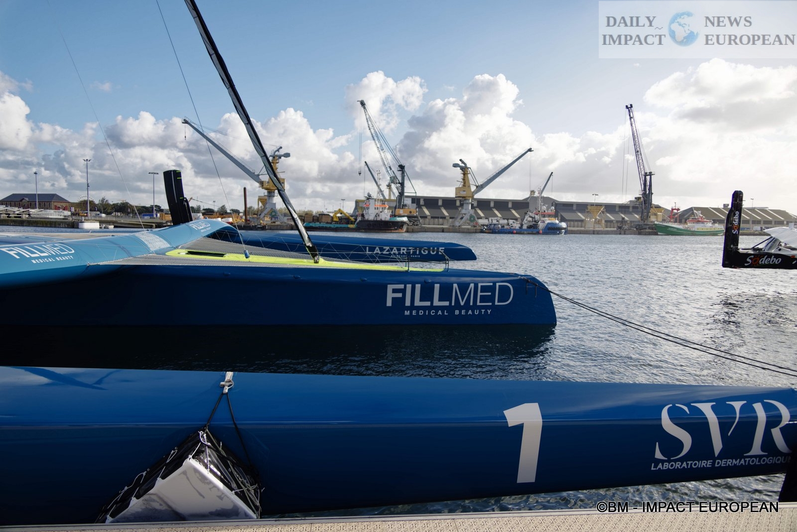 3 boats still in the ports of Brittany: Trilogik – Dys De Coeur (Daniel Ducosson, Rhum Multi), Bateau Cit’hôtel-Région Guadeloupe (Sacha Daunar, Class40), Banque Populaire XI (Armel Le Cléac’h, Ultim 32/23 ).