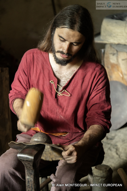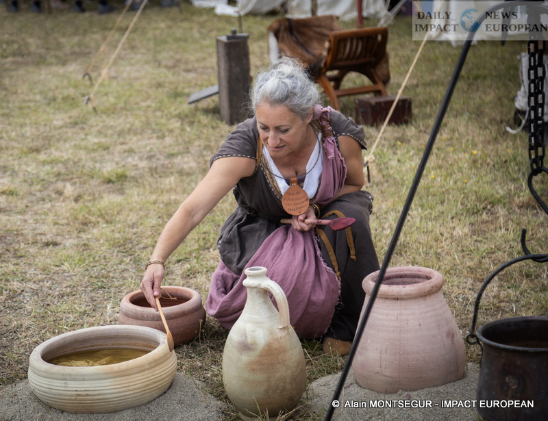 Visitors don’t just see a static display, they enter a living space. Every zone of the camp is animated by costumed interpreters: weaponry demos, historical explanations, presentations of military hierarchy, stories of Roman campaigns. Guides present Roman cooking, guard rotations, maintenance tasks, sword sharpening, daily rations. A Roman coin minting workshop helps explain the economic and propagandistic role of Caesar’s denarius. Children can take part in observation games, tactical trails, and symbolic infiltration missions in the Gallic village.