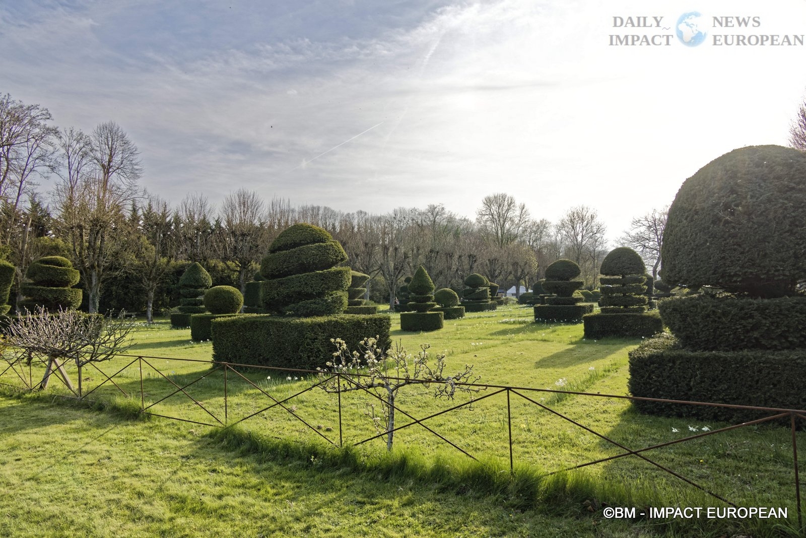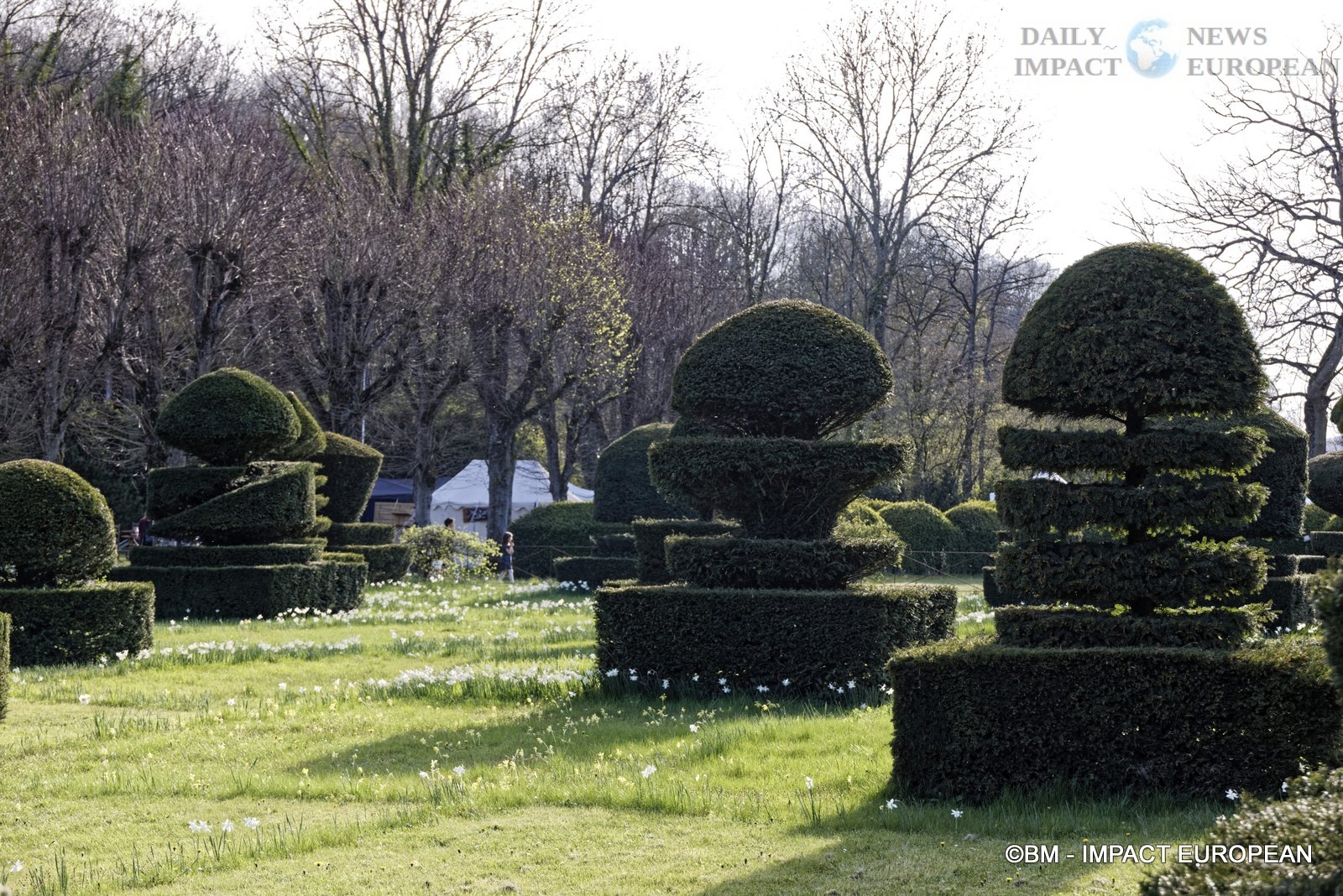We can now walk in the secret garden composed of 4 squares of white and black tulips where the statue of Neptune dominates the peliduve of horses; the greenhouse garden, made up of 24 squares of peonies, helllebores and black tulips; the garden of the sun whose rays are cut in boxwood replanted according to a design from the Louis XIV period; the garden of the eye consisting of a boxwood alley going from the terrace to a pond where a kneeling statue of Atlas sits; and the Moon Garden, inspired by that of the Villa Gamberia in Florence with a hemicycle of clipped yew trees which houses 8 bronze statues.
