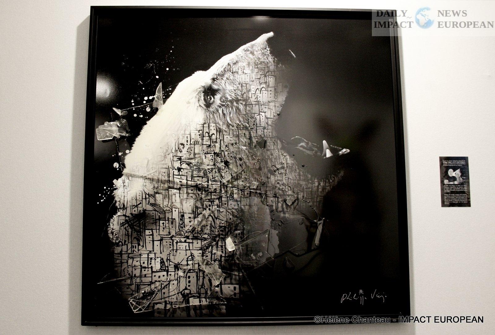 Philippe Viejo, meanwhile, draws his inspiration mainly from his travels to create his paintings. His work invites viewers to question themselves. We can give the example of his painting representing a « pizzly » which is a hybrid, between a polar bear and a grizzly; usually, these two species of bears do not meet. The pizzly could be a new species of bear spawned by global warming; the rise in temperatures having forced these two types of bears to find themselves on a common territory. The city painted partly on the pizzly could also make think of a growing urbanization which encroaches on nature.