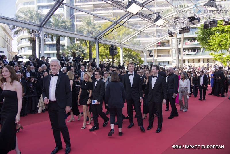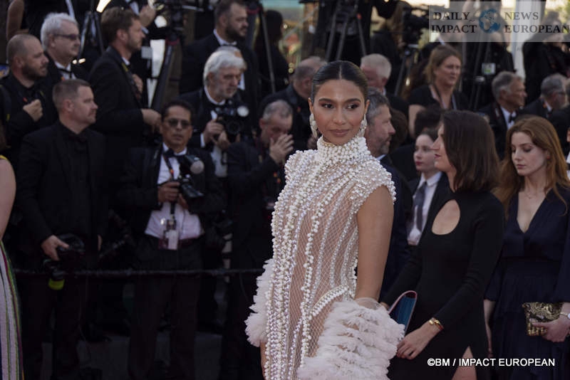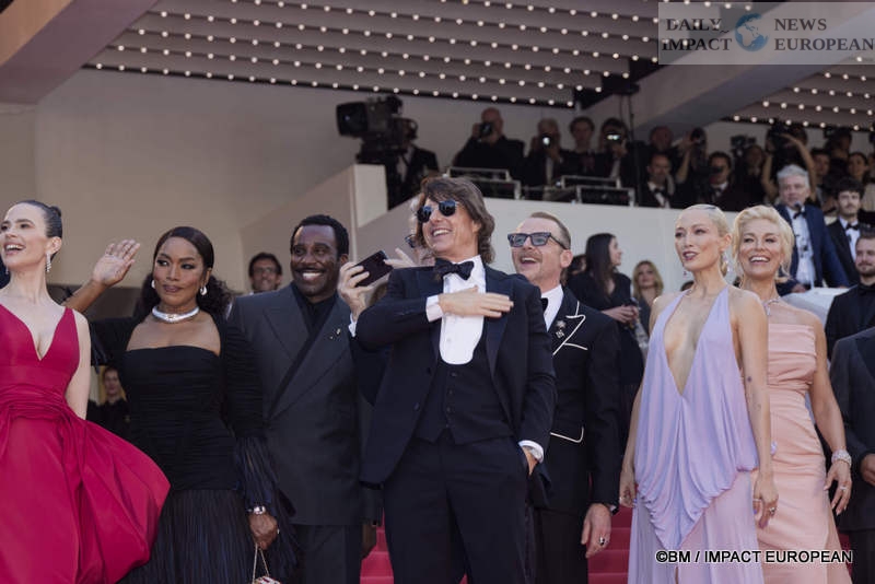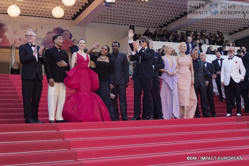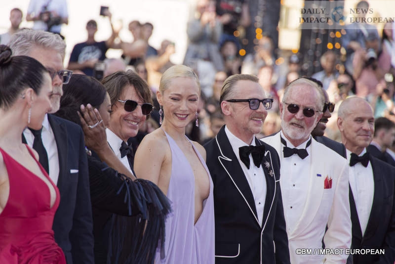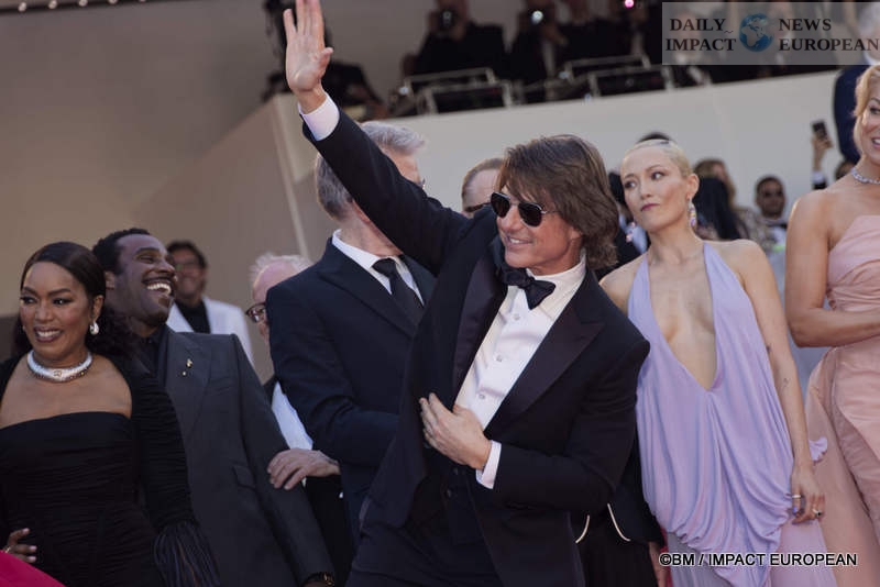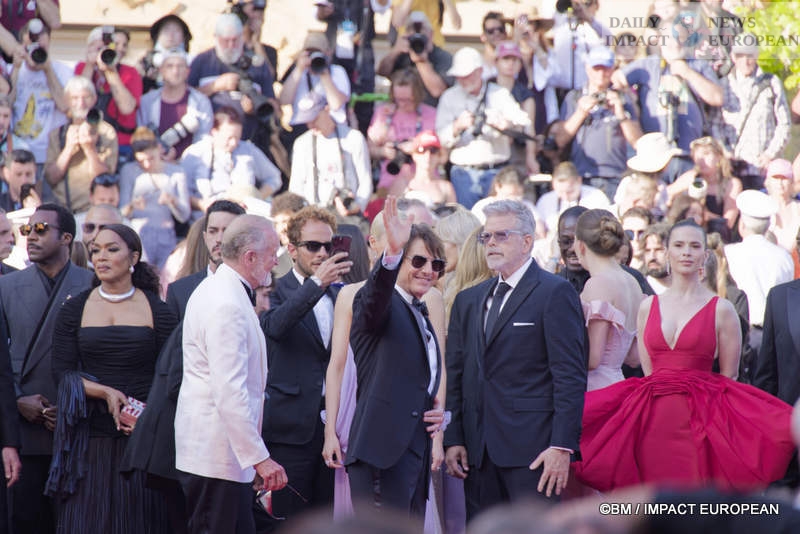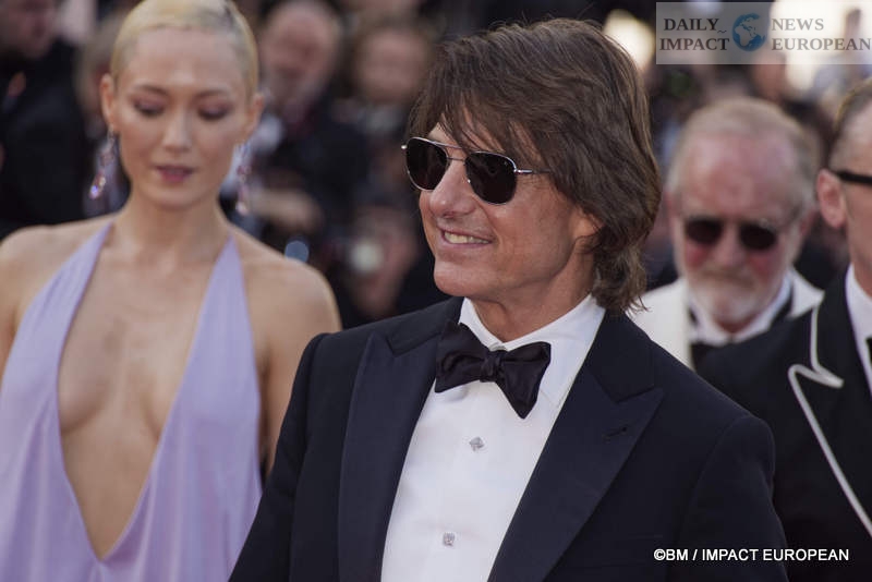 Tom Cruise arrived on the red carpet wearing a black suit, bow tie, and Top Gun-style sunglasses. Part of the cast, including Pom Klementieff, Angela Bassett, and Simon Pegg, and director Christopher McQuarrie were also present in Cannes.