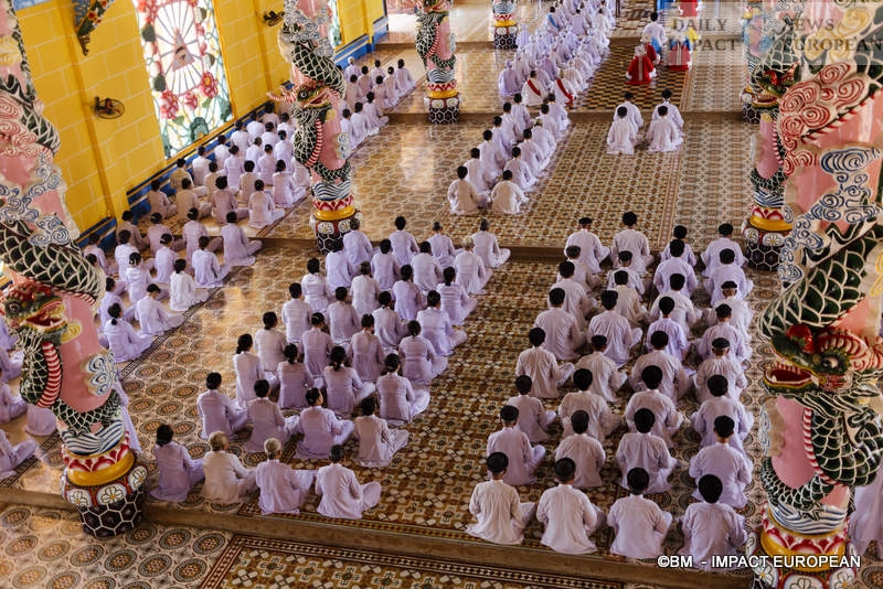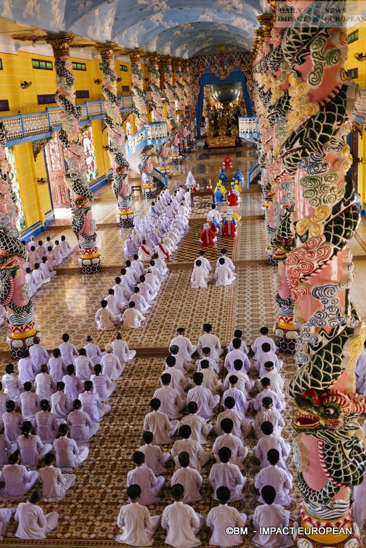 Followed by 50,000 followers in central Vietnam, Cao Dai Temple offers 35-minute prayers, at fixed times, 4 times a day, at 5:30 a.m., 11:30 a.m., 5:30 p.m. and 11:30 p.m. A real spectacle, it allows hundreds of visitors to watch it from the balconies inside the temple or near the entrance doors. The ritual has not changed since the origins. The door on the left, leading to the complex is for women, the one on the right for men. Before entering, you must remove shoes and hats, the doors of the sanctuary are separated from the door for the followers even if the priests of the 2 sexes use the central door. Musicians installed in the gallery above the entrance porch accompany the prayers of the faithful.