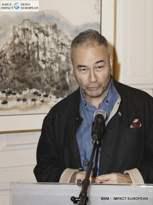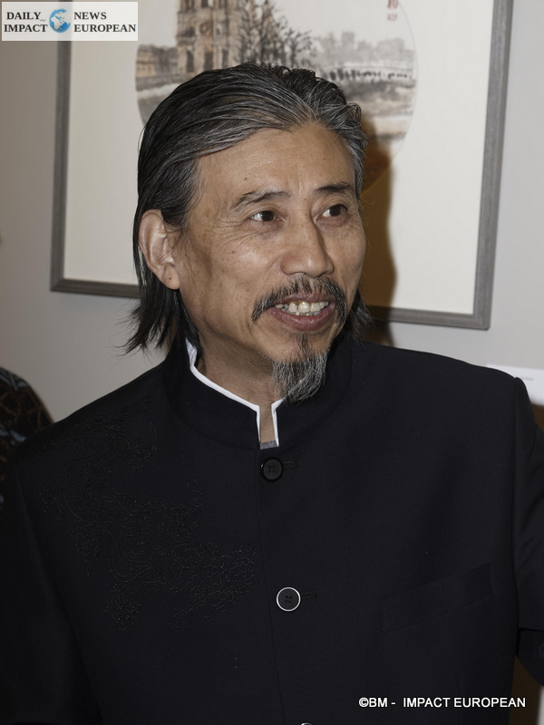 Qixiang Zhou is from Liaoning and was born in Xi’an, the capital of Shaanxi Province. Very young, he became interested in painting (he has been painting for 40 years) and bronze sculpture preferably because it is a subject he learned at the Institute of Fine Arts in Xi’an and then at Central Institute of Fine Arts under the direction of several renowned Chinese sculptors. Simultaneously, he completed his training in Chinese painting. He owes his inspiration to the painting of beings (shepherds, peasants and students …) and landscapes (Gobi desert in Xinjiang province, southern banks of the Yangtze river, then from the 80s the wild regions of the southwest from China: Sichuan and Yunan), memories of his many trips through China. He was also inspired by French churches including Notre-Dame de Paris. We find the spirit of his sculptures in his paintings which come to life under his brush and earn him awards for several of his works including « Wheat Harvester » selected at the 10th National Exhibition of Fine Arts which is held every 5 years and « Ansai Belt Tambourine » chosen for the collection of artistic works for the 2008 Olympic Games. Member of the Chinese Committee for the sculpture sector, Qixiang Zhou is the bearer of ten social titles. Some of his paintings and sculptures, including bronze busts, some up to 20 meters high, are sold in the United States, Australia and Japan. He made his first exhibition in France 5 years ago because France is a country where all Chinese artists dream of working and exhibiting. We were fortunate to see him realize in 5 minutes a work with a brush in black and in color.