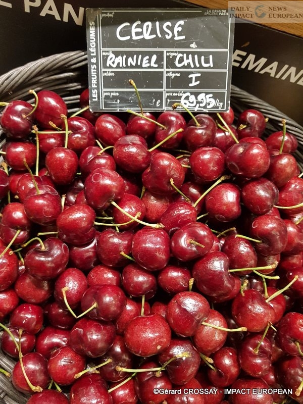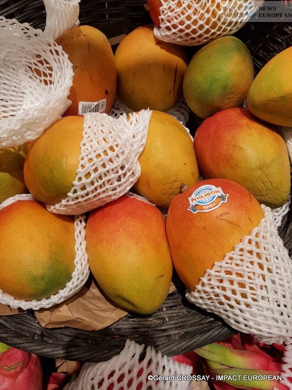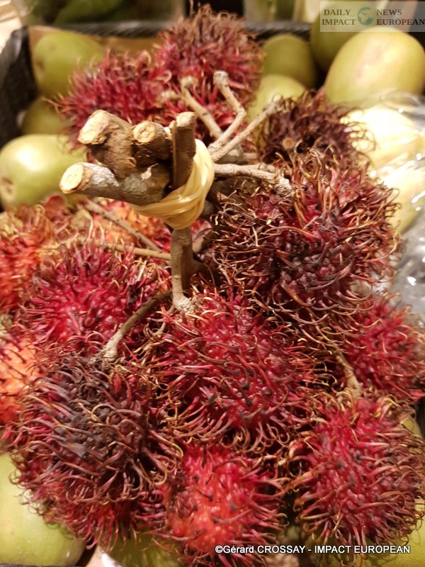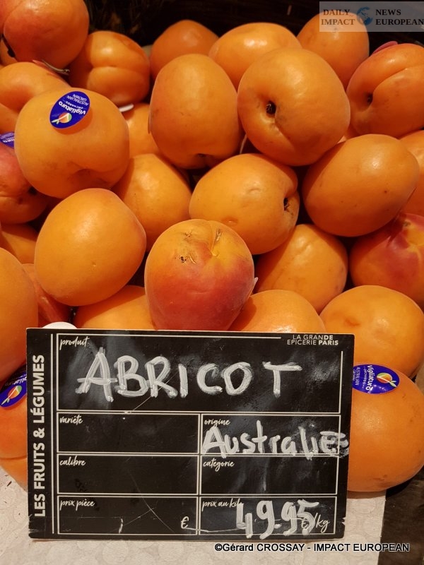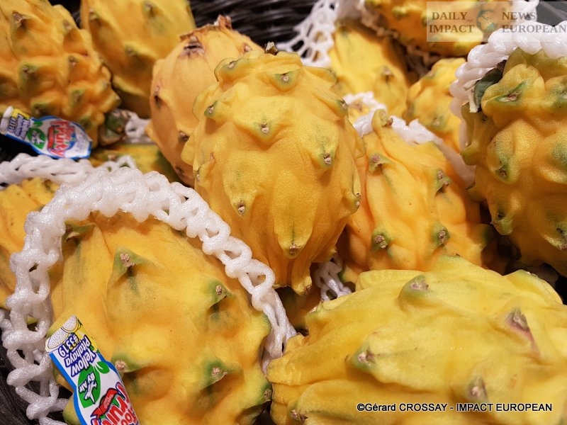 At the bend of an aisle, we stumble upon enormous pot-bellied pannetones from Italy and then end up on the colorful aisle of exotic fruits – annones, guavas, lychees, mangoes, papayas, pitayas, rambutans, physallis – or imported from southern hemisphere, apricots from Australia, cherries from Chile, peaches from Argentina.