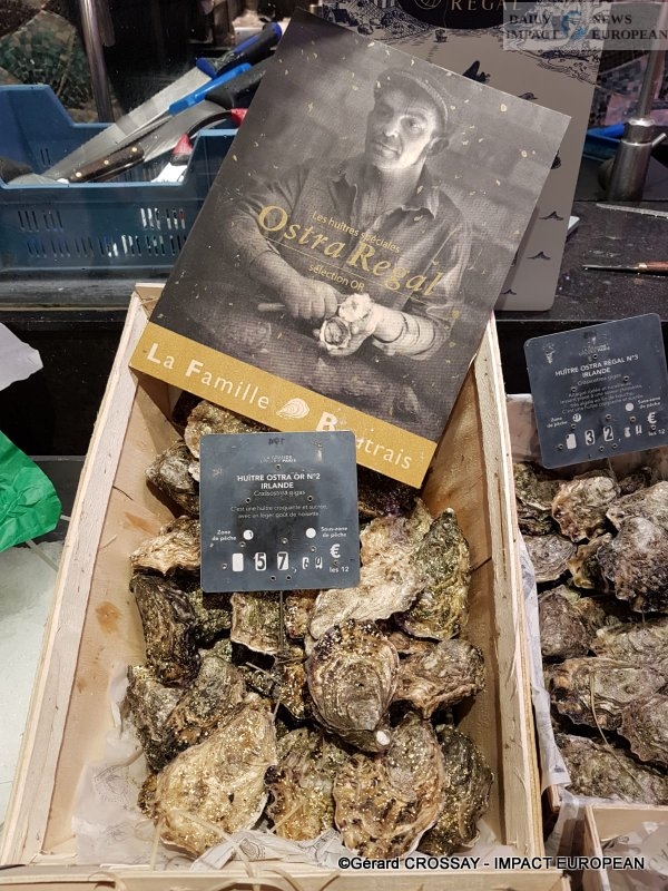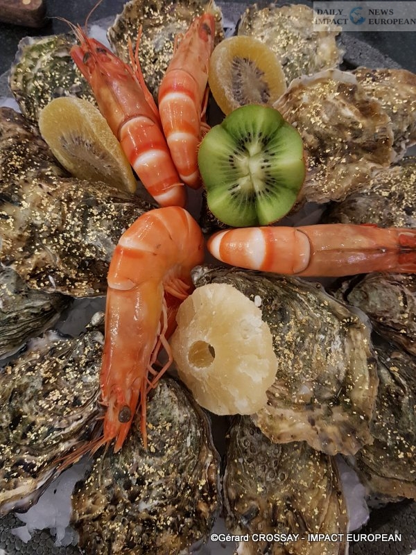 The fishmonger is overflowing with line-caught bass, soles, fresh bluefin tuna, abalone, sea urchins, large wild shrimp, langoustines and royal Breton lobsters, giant crabs… We notice exceptional oysters, powdered with gold, the Ostra Regal, fleshy and sweet.