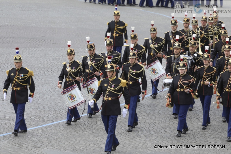 Emmanuel Macron marches up the Champs-Élysées, accompanied by the large mixed escort of the Republican Guard, to preside over the ceremony under the Arc de Triomphe.