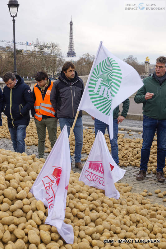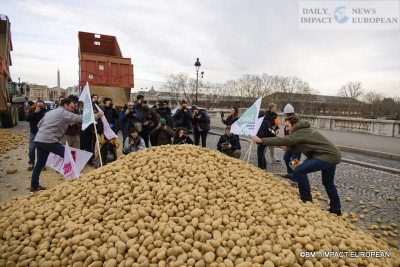 The protestors drove through major avenues such as the Champs-Élysées and gathered near the National Assembly. Slogans like “No country without farmers” and “No farmers, no food” were displayed on tractors. In a symbolic act, between 20 and 30 tons of potatoes were dumped on the Pont de la Concorde and made freely available to the public. This action was meant to show farmers’ frustration and to warn about the future of food sovereignty in Europe.