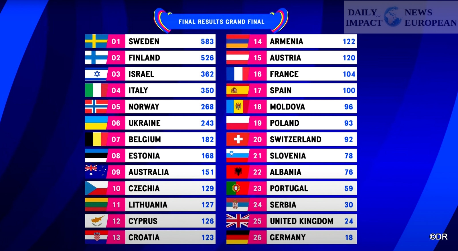Sweden won the 67th edition of the Eurovision Song Contest ahead of Finland and Israel, with 583 points for their song Tattoo. Loreen is the second artist to win the competition twice, after Irishman Johnny Logan in 1980 and 1987. She had already won in 2012 with Euphoria. Above all, she enters the history of the competition by becoming the first woman to win twice. Sweden thus equals the record of victories at Eurovision (seven) previously held by Ireland.
