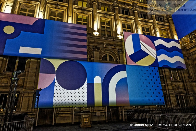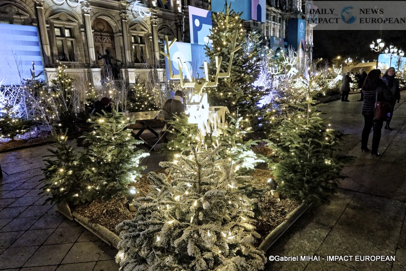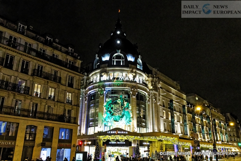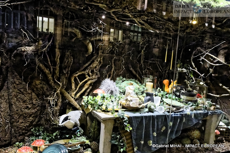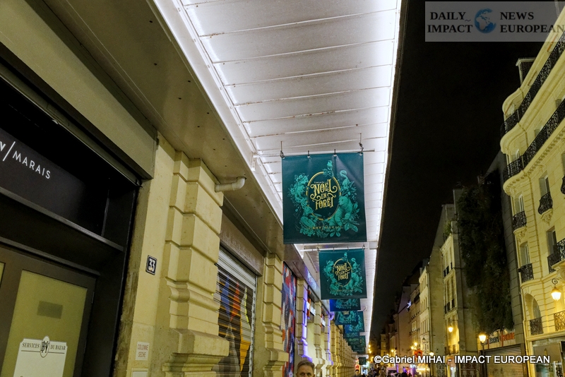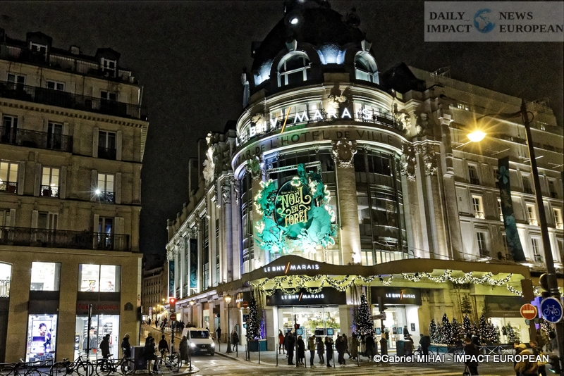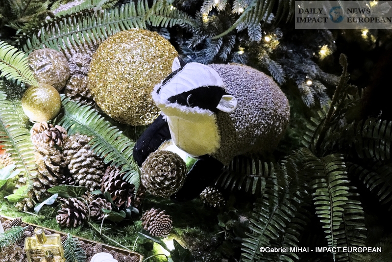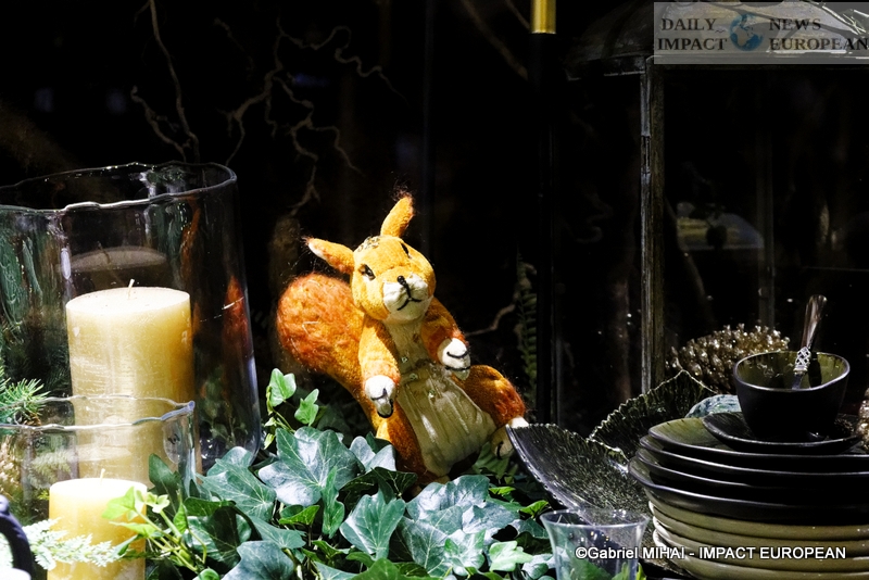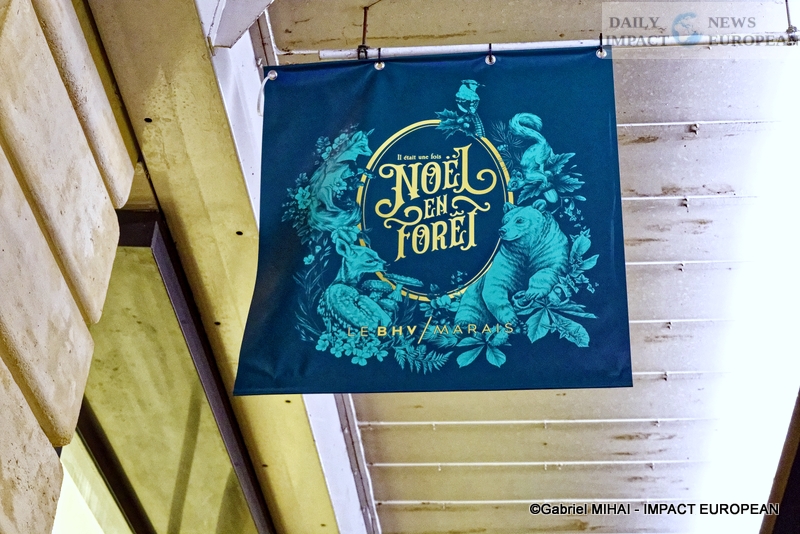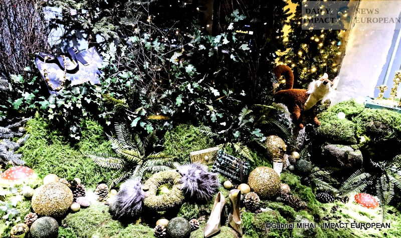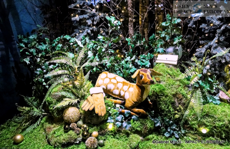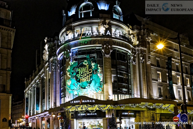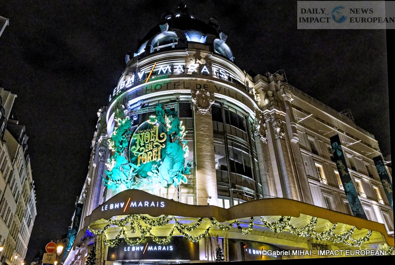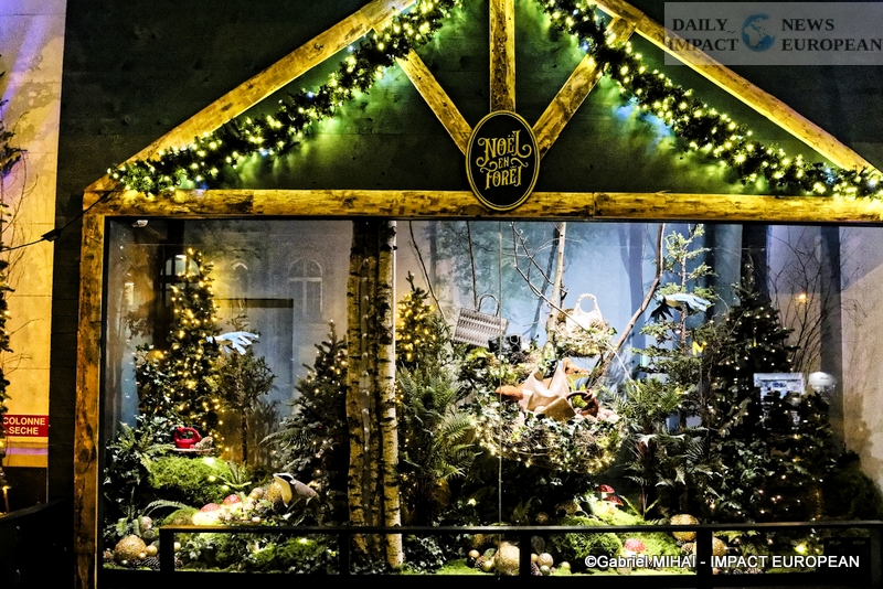 Colorful and lively windows at BHV-Marais, rue de Rivoli (75004), a play of lights illuminates the facades in a modern style on the theme « Once upon a time there was Christmas in the forest ». During the inauguration, on November 8, the store organized a show featuring a procession of animals under the illumination of the facades. A dedicated pop-up revealed a product offering.