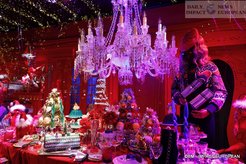 The theme « Paris jubilee » is on the program for the windows of the Samaritaine lit by chandeliers by Mathieu Lustrerie for Christmas 2023. From November 8, 2023 and until January 9, 2024, the Samaritaine is transformed into a « Palais es délices » where reign gluttony and French art of living and the art of hosting for a moment of joy. In the windows, fashion, trees and chandeliers mix. In the Atrium, we discover the magical world of Charlie and the Chocolate Factory. as well as festive or snackable activities. The aisles reveal the gourmet and offbeat works of artists Gab Bois and ThomasLiu Le Lann. The partner of the operation is Warner Bros for the release of the film “Wanka”. As for Santa Claus, we see him walking the aisles to the sound of swing (rock, charleston or breakdancing) that is in his skin.