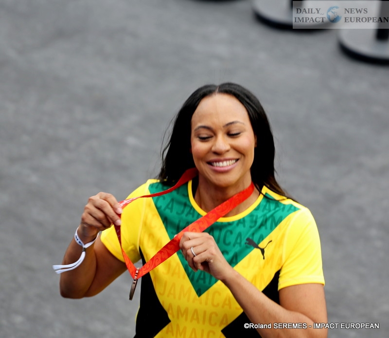 Jamaican Chelsea Hammond Ross was presented with her reassigned bronze medal in the women’s long jump from the 2008 Beijing Olympics on Friday at a ceremony at the Parc des Champions in the Trocadero Gardens in Paris.