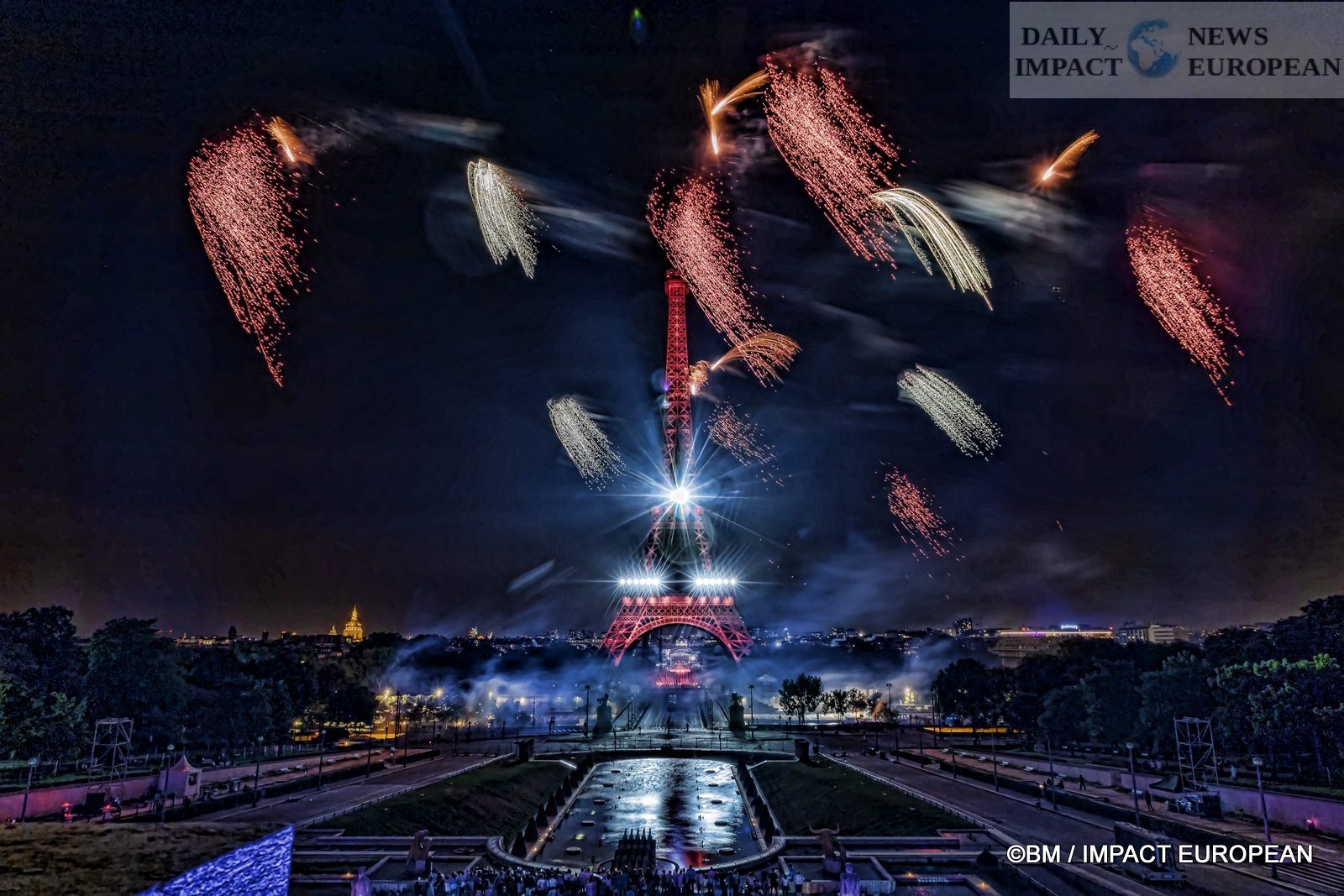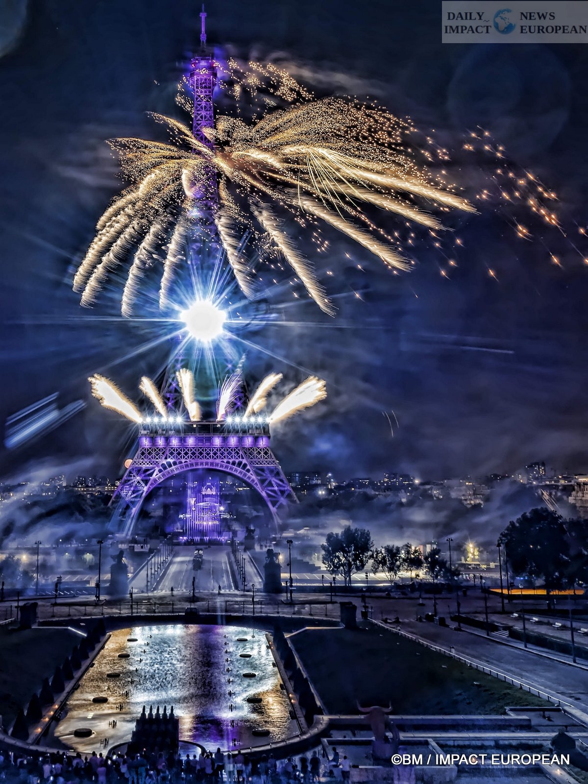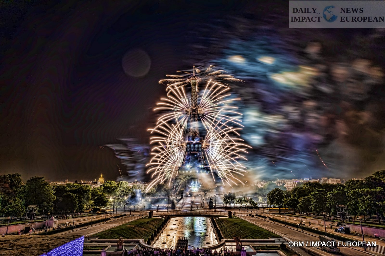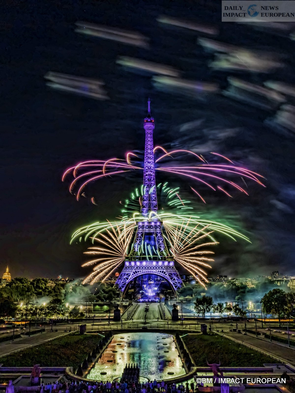 On D-day, at zero hour, a hundred people, including 14 pyrotechnicians, were at the controls in order to create the 14 paintings planned during the show, On the theme of Freedom, Carpe Diem (let’s take advantage of the present day), the paintings followed, among which was the « Marseillaise » taken up by the public, then a tribute to Régine, who died on May 1, to the sound of her essential « Petits papiers. Each painting was accompanied by an appropriate musical piece, including Stromae, Orelsan, Prince, Phil Collins or Bilie Eilish.all synchronized.Another significant event, the tribute to Ukraine showing an Eiffel Tower in Ukrainian colors, yellow and blue, to the sound of « Stefania », title of the winning group of Eurovision, Kalush Orchestra.