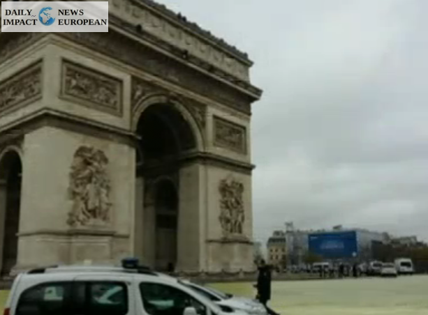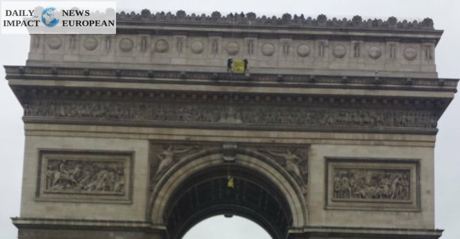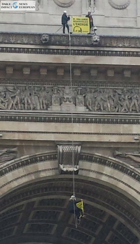 Greenpeace is used to punch operations. On Friday, two activists from the environmental association hung out at the Arc de Triomphe, carrying a small banner marked with: « Mr. Hollande, renew the energy ». The cobblestones of Place de l’Etoile have also been covered with yellow paint.