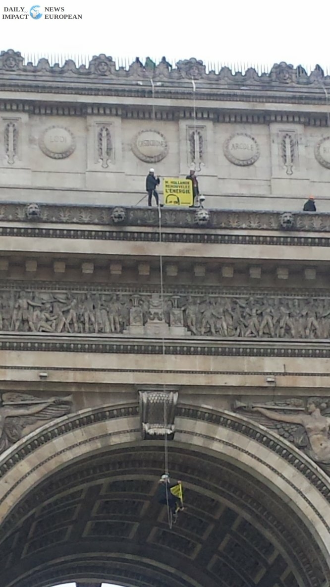 Greenpeace activists were arrested on Friday, including after covering the pavement of Place de l’Etoile with yellow paint. Two of them hung out at the Arc de Triomphe to call on François Hollande for more renewable energy.
