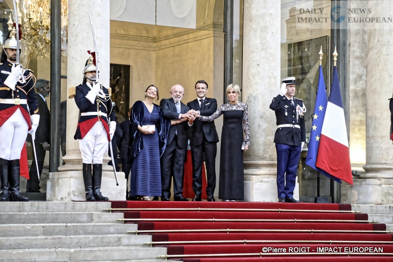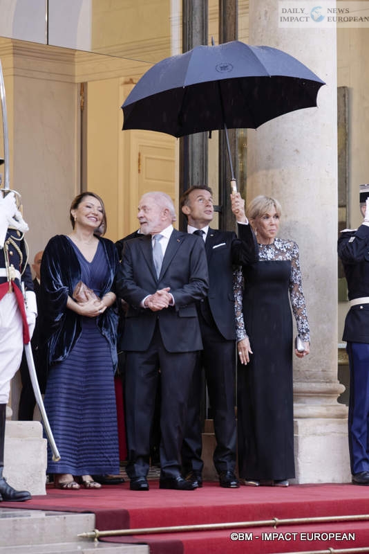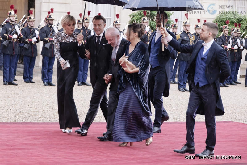 After this sumptuous meal under the gilded ceiling of the Élysée Palace, the Macrons took their two honored guests to Paris for an evening outing. Despite the rain, the four friends went to see the Eiffel Tower, lit up for the occasion in the colors of Brazil, and immortalized the moment with a selfie posted on the French head of state’s social media. Lula, for his part, preferred to share a video in which he declared: « We are in Paris, at the Eiffel Tower. Macron and I are working to improve France and Brazil. We are two friendly countries. » The video ends with a frank hand-to-hand exchange between the two men as the monument lights up behind them.