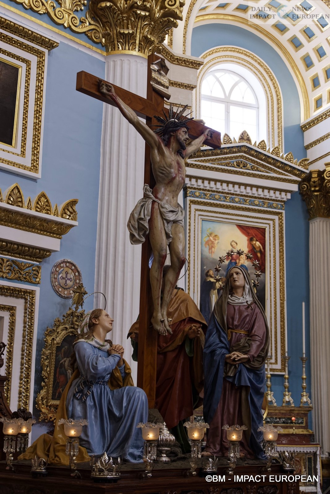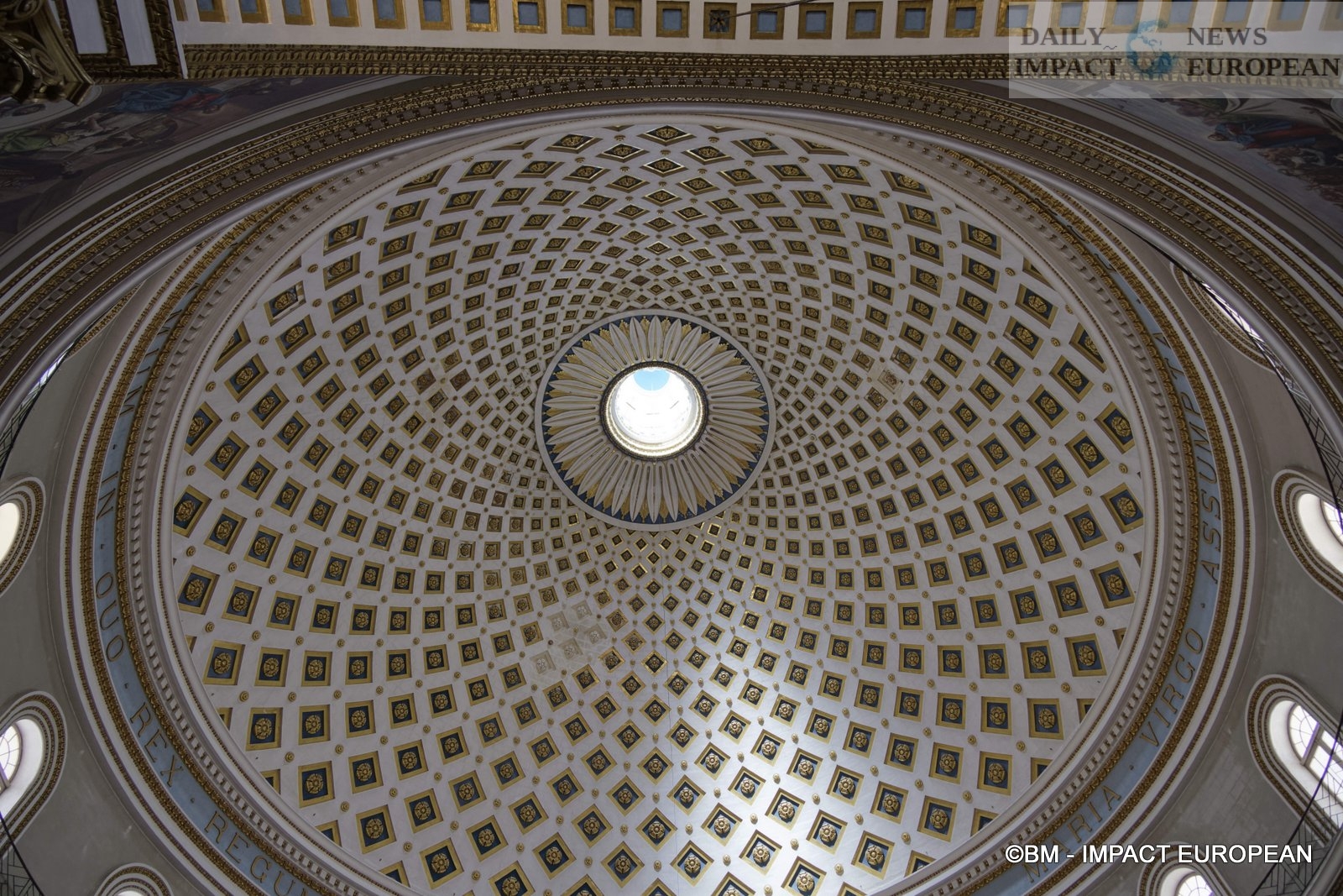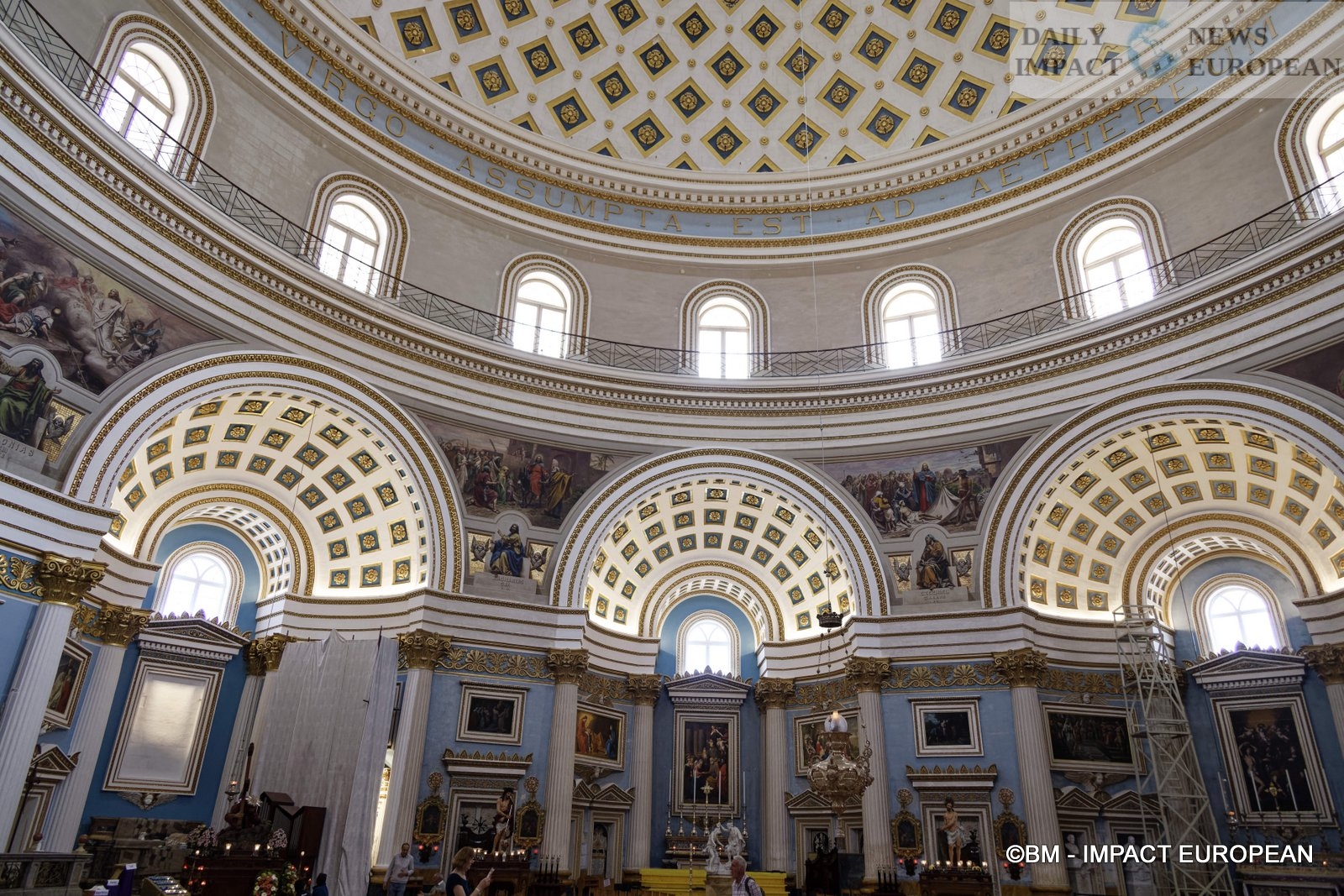 Inside, blue and gold are the dominant colors. A cupola 39 meters in diameter was erected without a framework. A statue of Our Lady, made by Vincent Apap in 1947, is on the left at the entrance (it is taken out every year for the procession on August 15, a national holiday); a work by Stéfano Erardi (1630-1716) sits above the high altar.