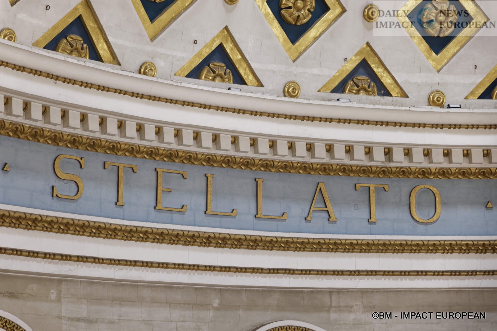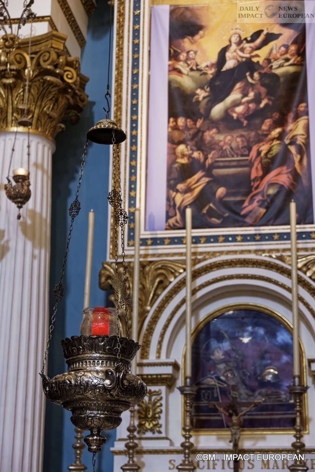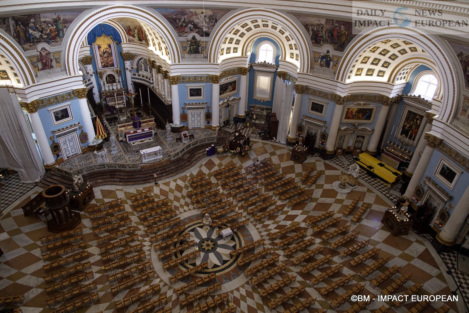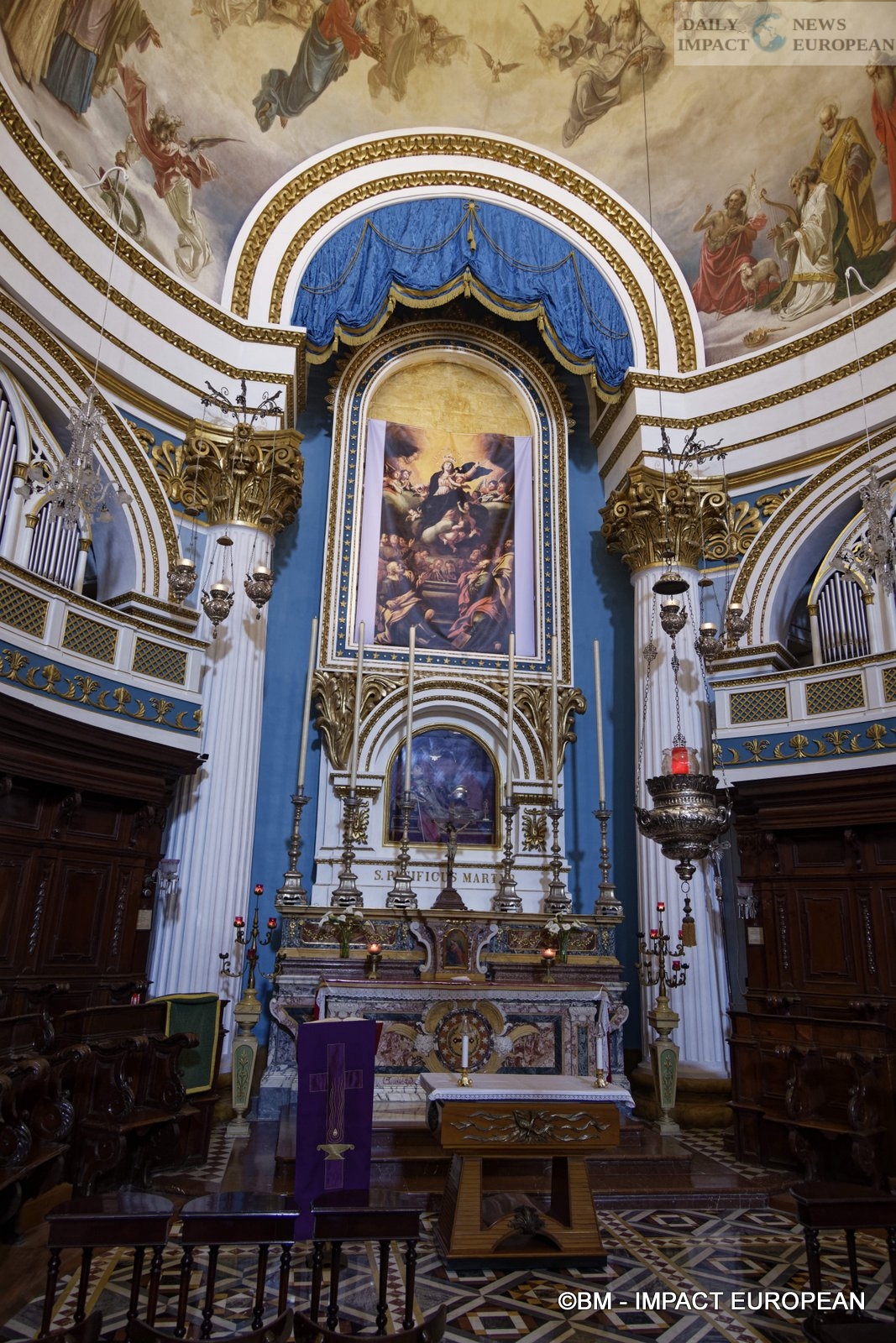 Inside, blue and gold are the dominant colors. A cupola 39 meters in diameter was erected without a framework. A statue of Our Lady, made by Vincent Apap in 1947, is on the left at the entrance (it is taken out every year for the procession on August 15, a national holiday); a work by Stéfano Erardi (1630-1716) sits above the high altar.