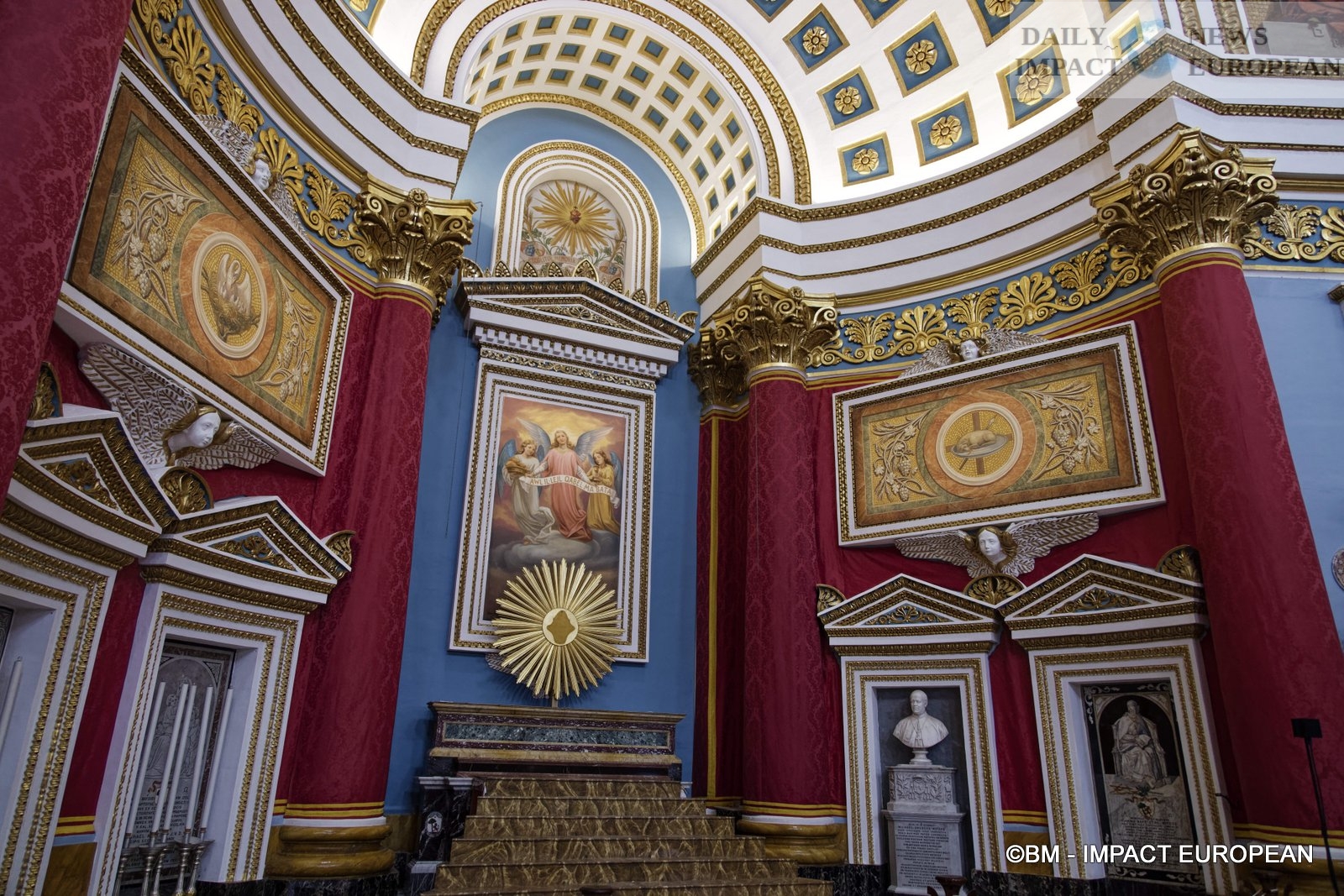 The Mosta Rotunda is one of Malta’s largest and most famous churches, designed by architect George Grognet de Vassé and inspired by the Pantheon in Rome. Planning permission was granted in 1832 and construction began in 1833. The Rotunda has a diameter of 55.20 meters outside and 39.60 meters inside. The south-facing facade has 6 columns in the Ionic style, the construction is based on the principle of the catenary profile (each stone is placed on the one below and keeps it in place). Since 1860, works of art have been added and the building became a minor basilica on July 29, 2018.