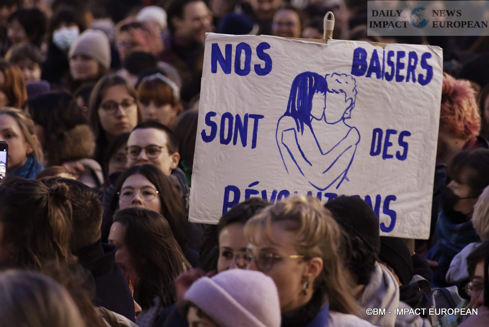 The rally took place at 6:30 p.m. on the forecourt of the Opéra Garnier to head towards the Hôtel de Ville. It is mainly aimed at women who could not take part in the demonstration on March 8, International Women’s Day.