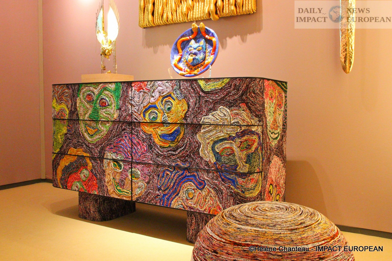 There were also creations by Simone Post, a Dutch designer. She made the decor for a chest of drawers; and with twisted pieces of fabric, she created several faces. We also saw round poufs designed, among other things, with recycled mattress foam.