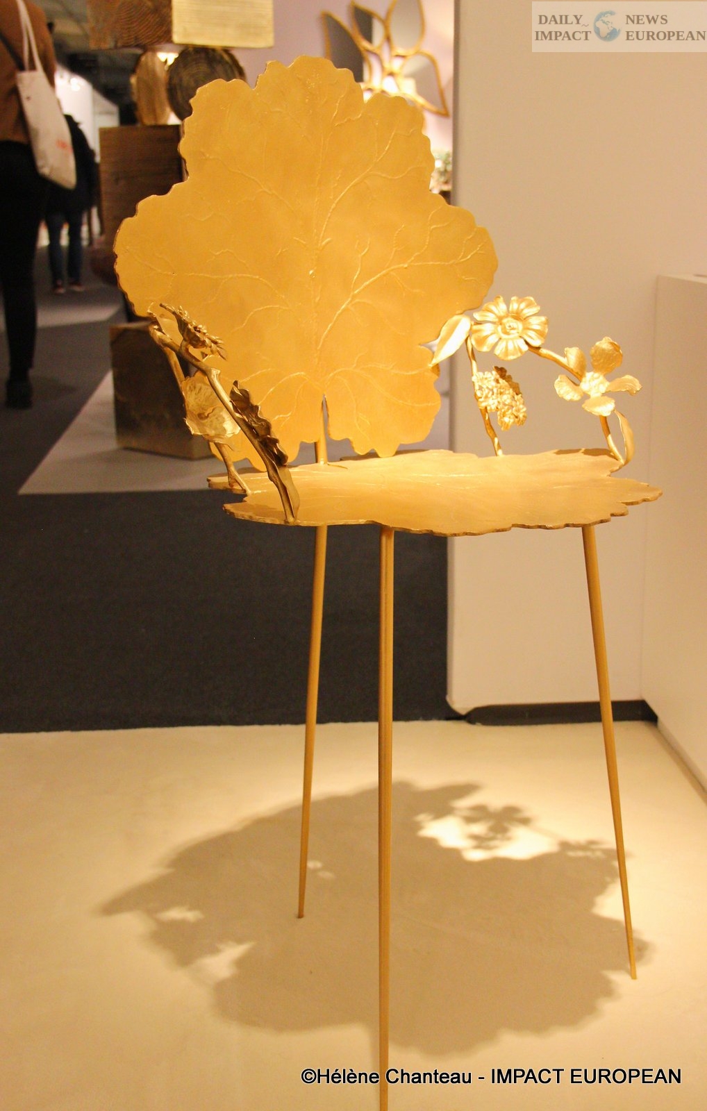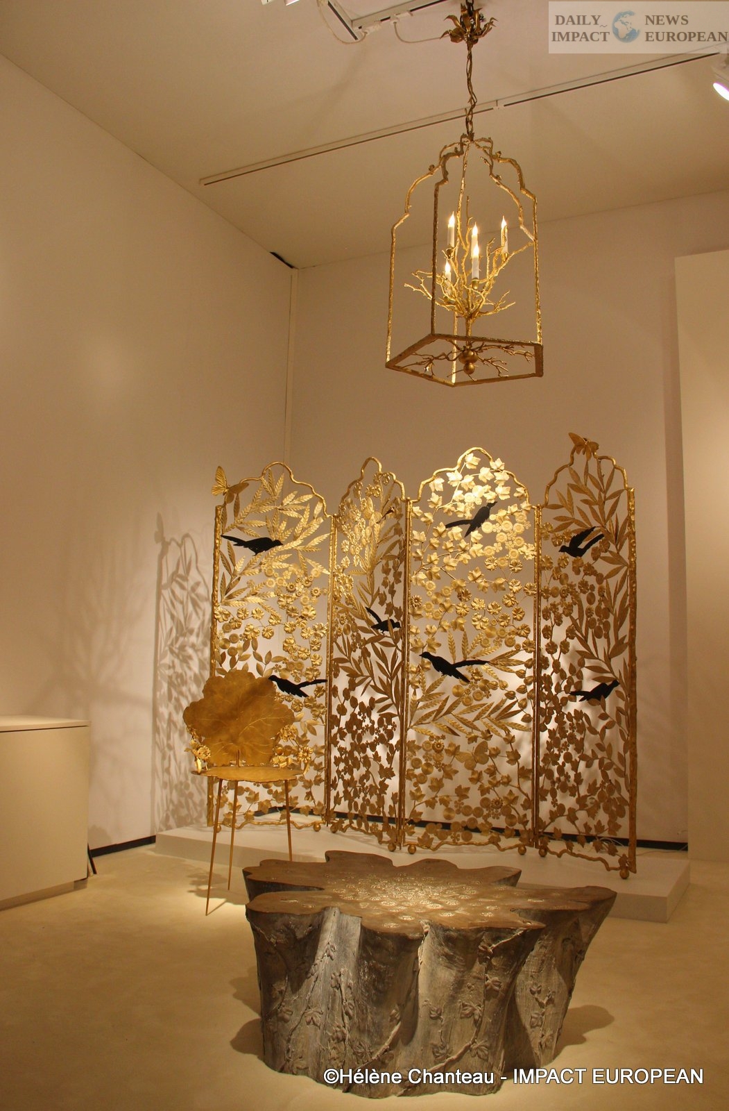 On the occasion of the Paris PAD, we were able to see, among other things, an openwork screen « Promenade de mai » with four sides, composed of leaves, flowers or even butterflies; the whole being in bronze with a golden patina with a few silhouettes of birds painted in black metal. There was also a pair of chairs with tripod arms in bronze with a golden patina, a coffee table representing a tree trunk and decorated with plant elements, or a lantern with a tree in its center supporting five arms of light.