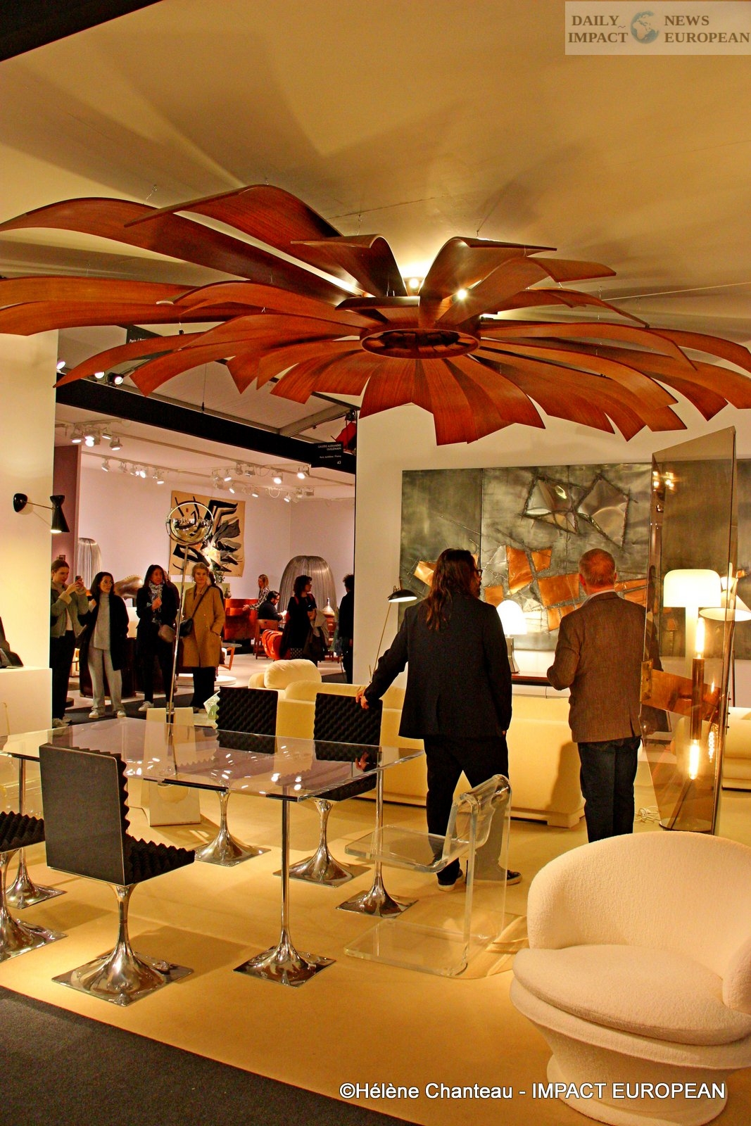 The Meubles et Lumières gallery also presented an impressive mahogany ceiling lamp, designed by the architect Mauro Mauriello in 1967, or a sculptural wall triptych in zinc and copper by the metal sculptor Sandor Kiss (1938-2013).