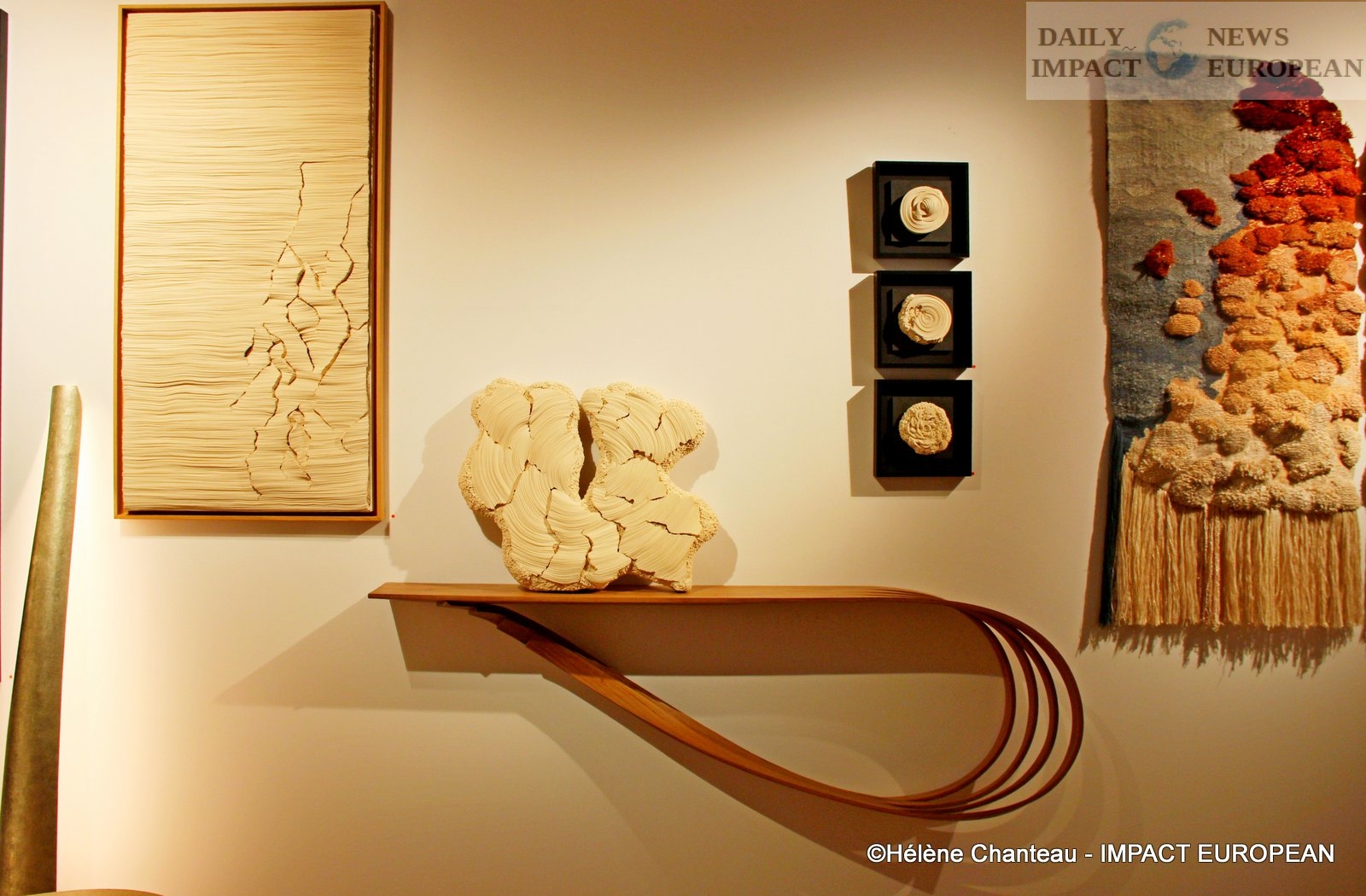The gallery also presented the works of Simone Pheulpin, a textile sculptor. She creates objects and paintings using strips of raw cotton fabric from one of the last Vosges factories. She also uses pins from the last French sewing pin factory, to be able to maintain her sculptures. On this show, his creations represented landscapes, fossilized stones or even shells. The Musée des Arts Décoratifs in Paris currently has three sculptures by the artist in its permanent collections.
