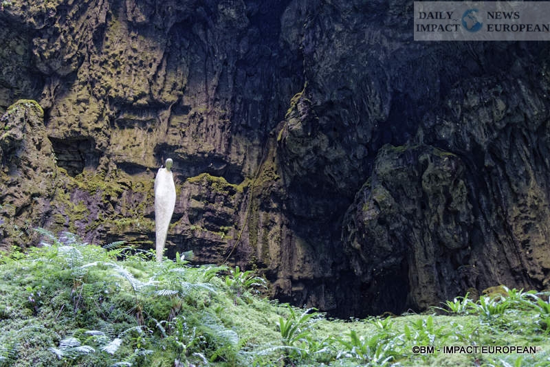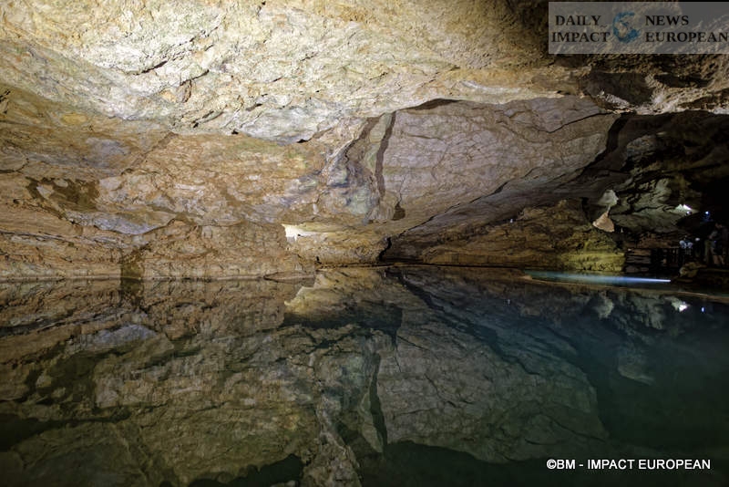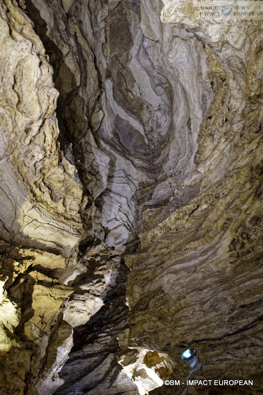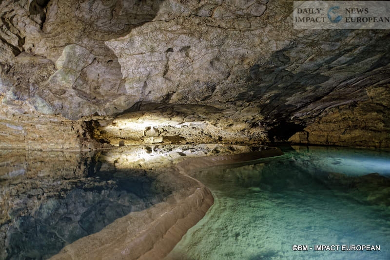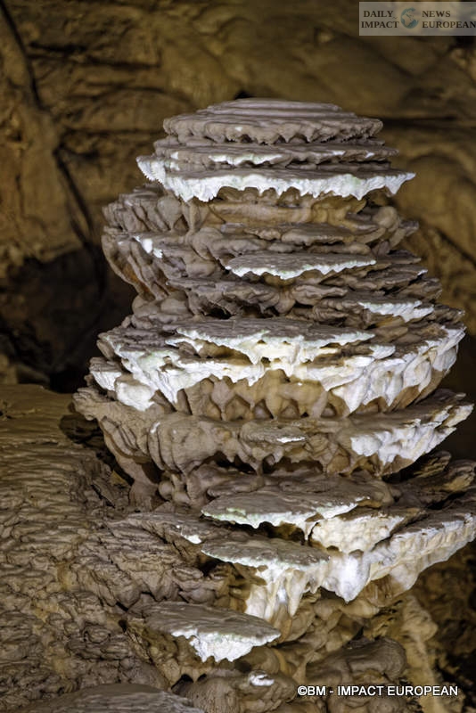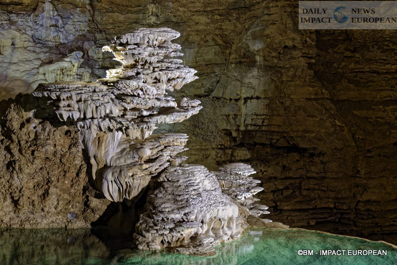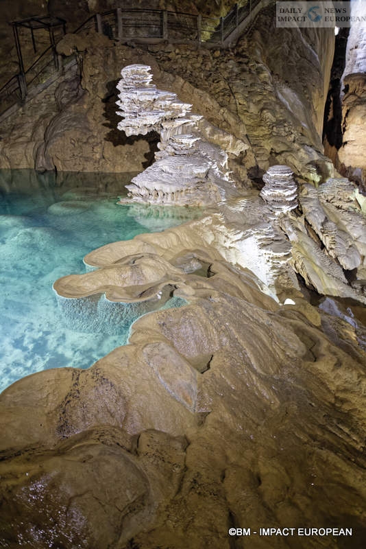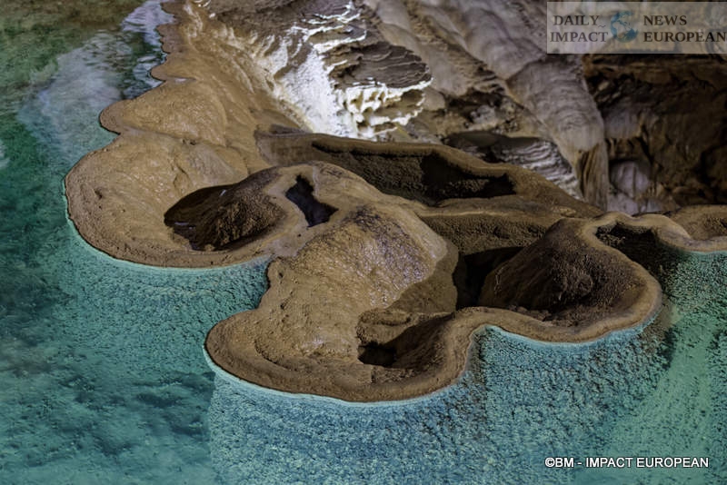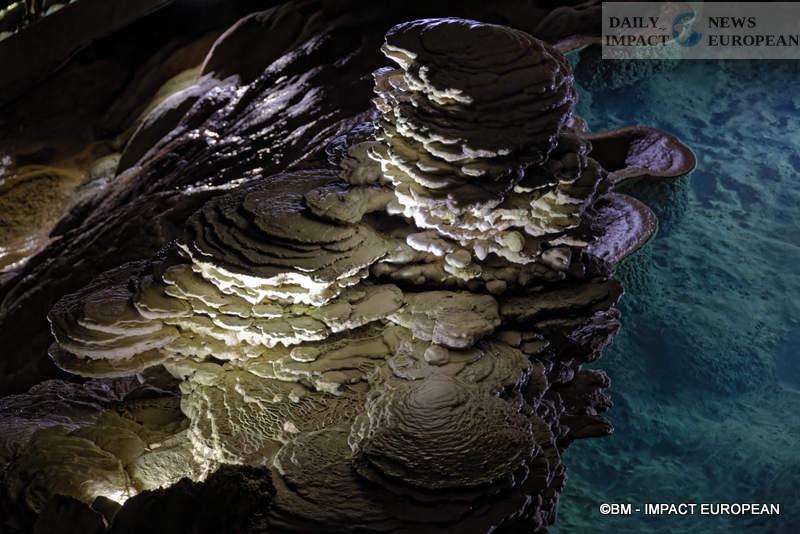 This is the opportunity to discover a whole architecture, starting with the Grande Pendeloque, a giant stalactite (falling calcite concretion which forms on the ceilings of caves and underground, by the slow and continuous fall of limestone water) of 60 meters from above. She seems to admire the surface of “Rain Lake.