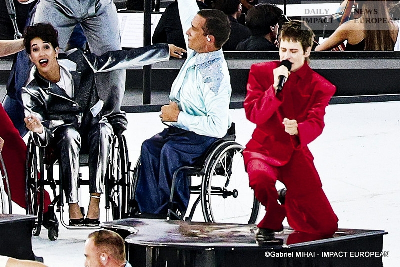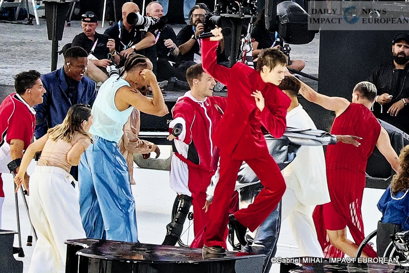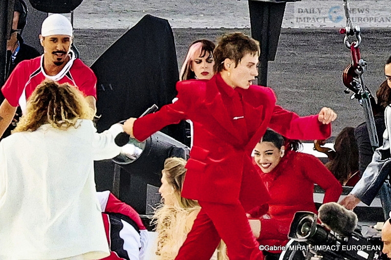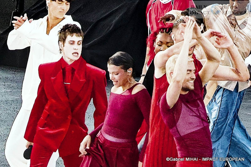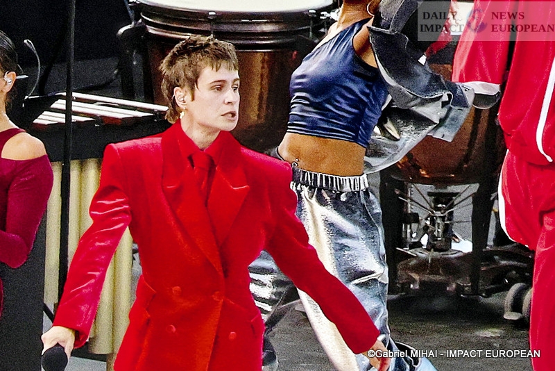 The taxi approached the stage, while 140 dancers dressed in black performed a choreography, to the rhythm of the music of Canadian pianist Chilly Gonzales, who performed the song Countdown composed by Victor Le Masne. Her artistic performance opened the sequence entitled “Discorde”, during which Redcar (formerly Christine and the Queen) sang “Non, je ne regrette rien” by Edith Piaf.