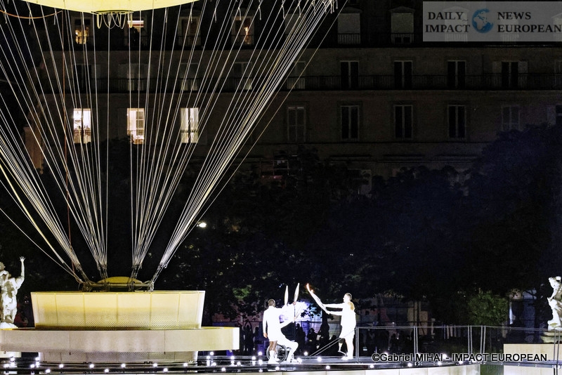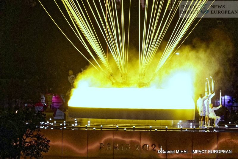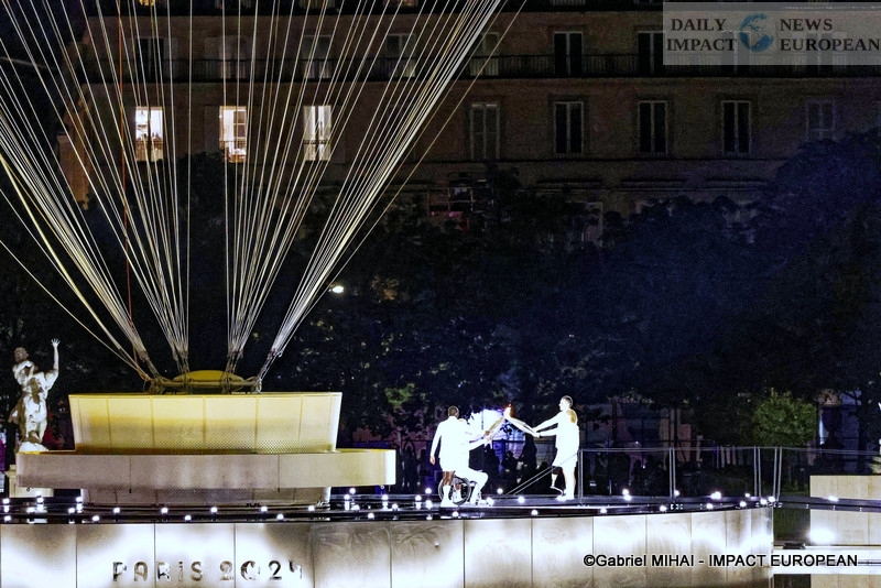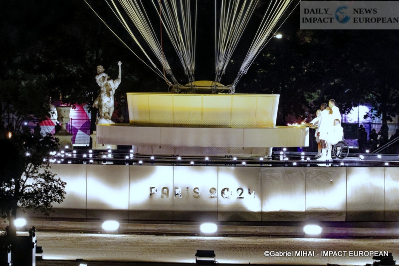 The cauldron was lit together by the last five torchbearers, all from the French team competing at the Paris 2024 Paralympic Games: Alexis Hanquinquant, Paralympic para triathlon champion at Tokyo 2020; Nantenin Keita, Paralympic para-athletics champion, 400m, at Rio 2016 and four-time medalist in the general classification; Charles-Antoine Kouakou, reigning Paralympic champion in the 400m T20 category at Tokyo 2020, in para-athletics; Elodie Lorandi, the most decorated active athlete with seven medals in para-swimming, including a gold in the 400m freestyle at London 2012 and Fabien Lamirault, the most decorated French athlete in the Paris 2024 delegation, quadruple gold medallist in para-table tennis and sixtuple medallist in the general classification.