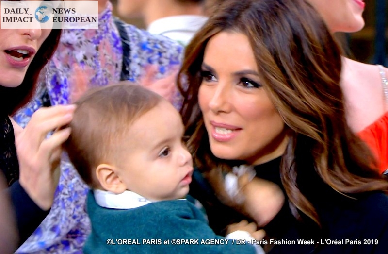 Eva Longoria, cosmetics brand ambassador, was present for her second show; the star of the small screen even walked the podium wearing her baby, Santiago, for the final.