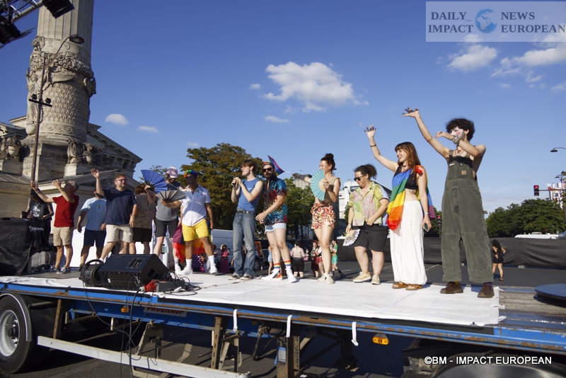 After a nearly five-hour march, the LGBTQIA+ community was welcomed by a large Pride 2025 podium located at Place de la Nation. Throughout the evening, it brought together artists committed to equality, including musicians, DJs, and drag queens. It was also an opportunity to raise public awareness about the fight against discrimination through community speeches and video screenings.
