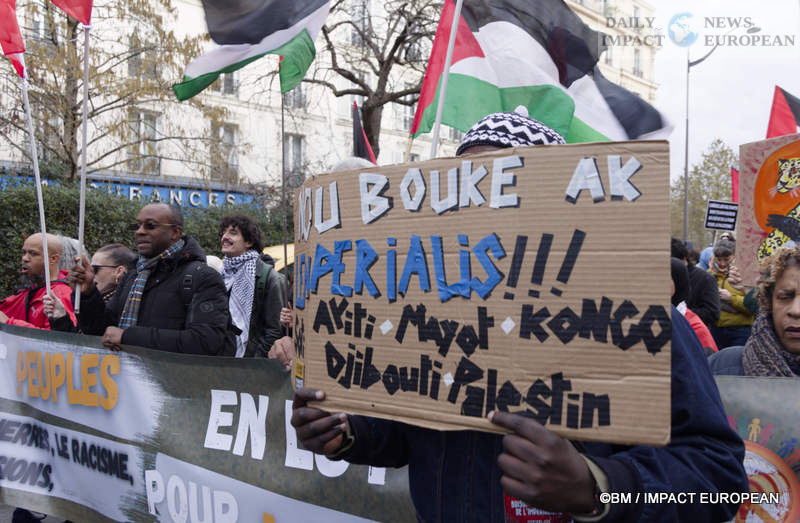 Organized by the citizen movement Noubouke, the march brought together participants from the Caribbean, Haiti, Palestine and Gaza, the Democratic Republic of Congo, Sudan, Lebanon, Syria, Venezuela, Iran, Kanaky, Colombia, and Peru. The demonstration unfolded peacefully, with the crowd chanting slogans that expressed international solidarity and resistance: