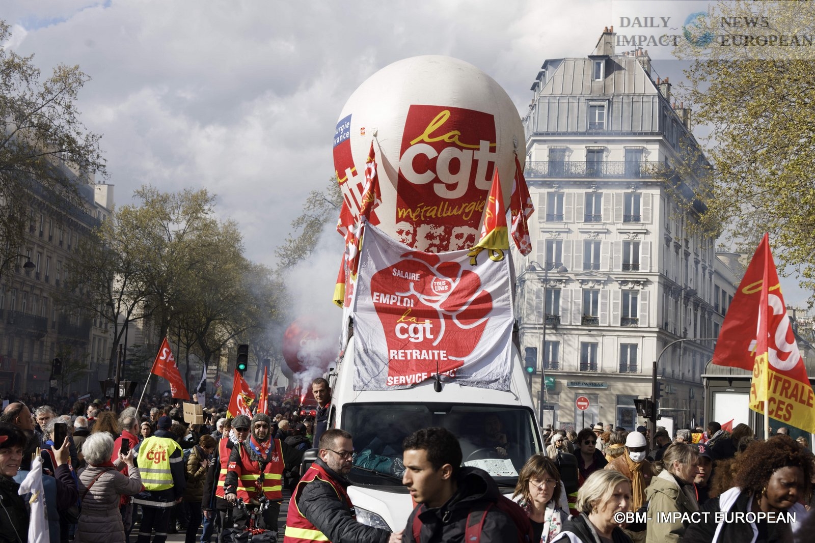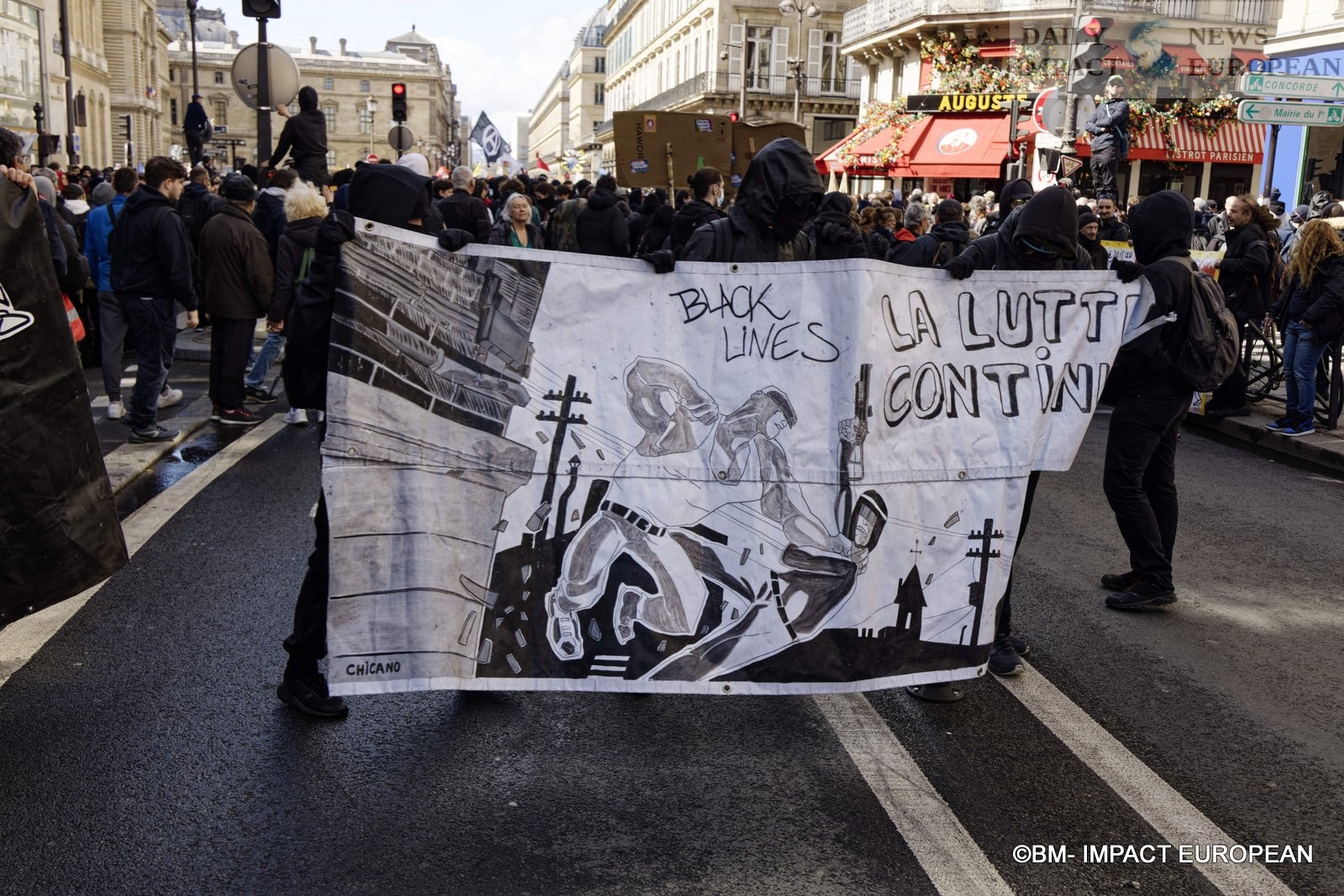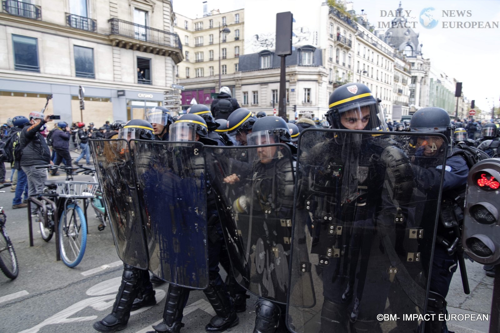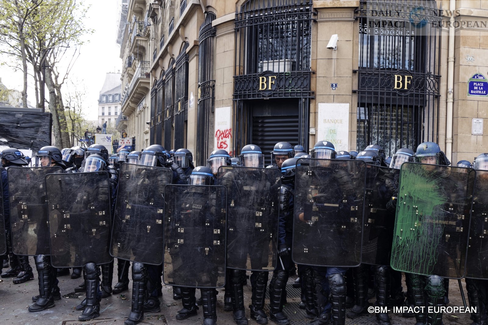 The procession of the Parisian demonstration, arrived for 30 minutes, on the place of the Bastille, of great tensions between a part of the demonstrators and the police are to be deplored. The police are notably positioned near the Banque de France to protect the building.