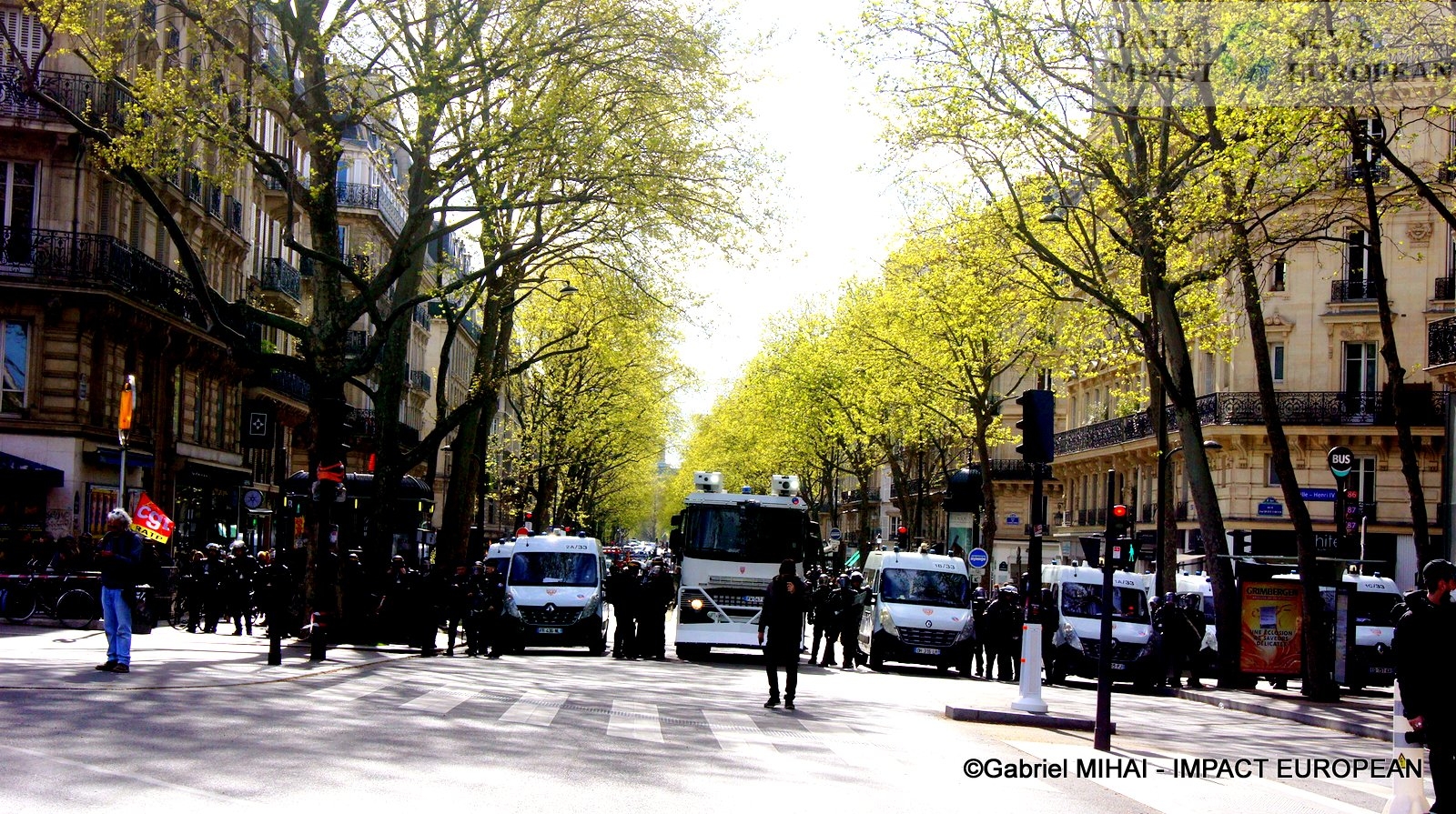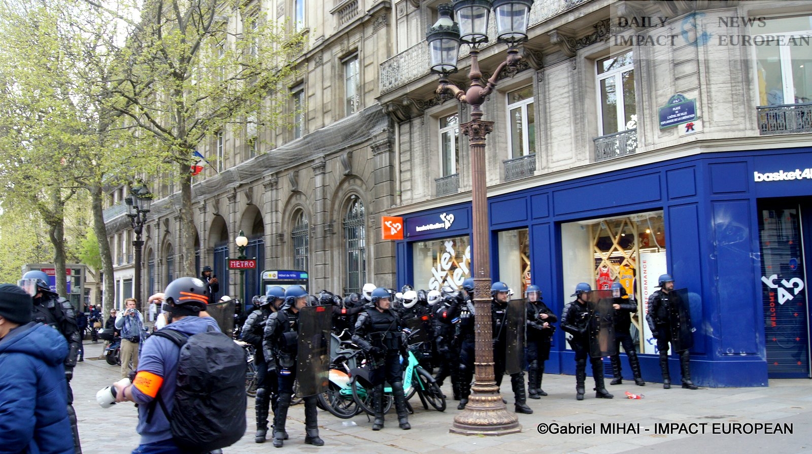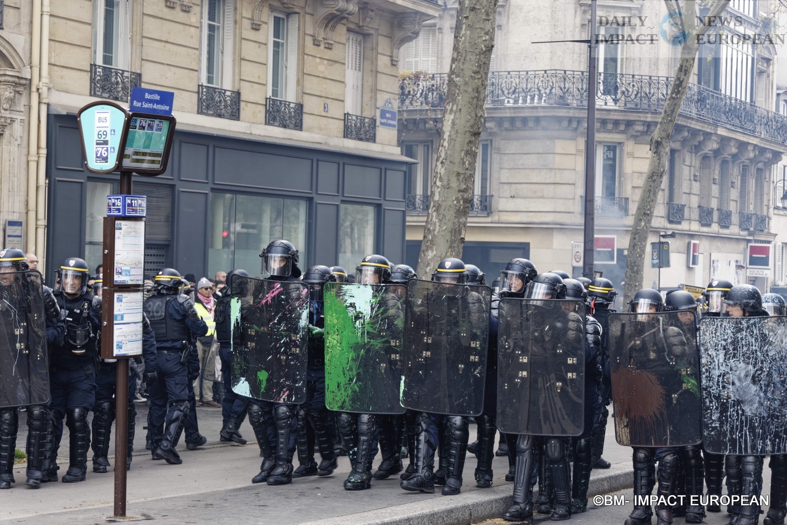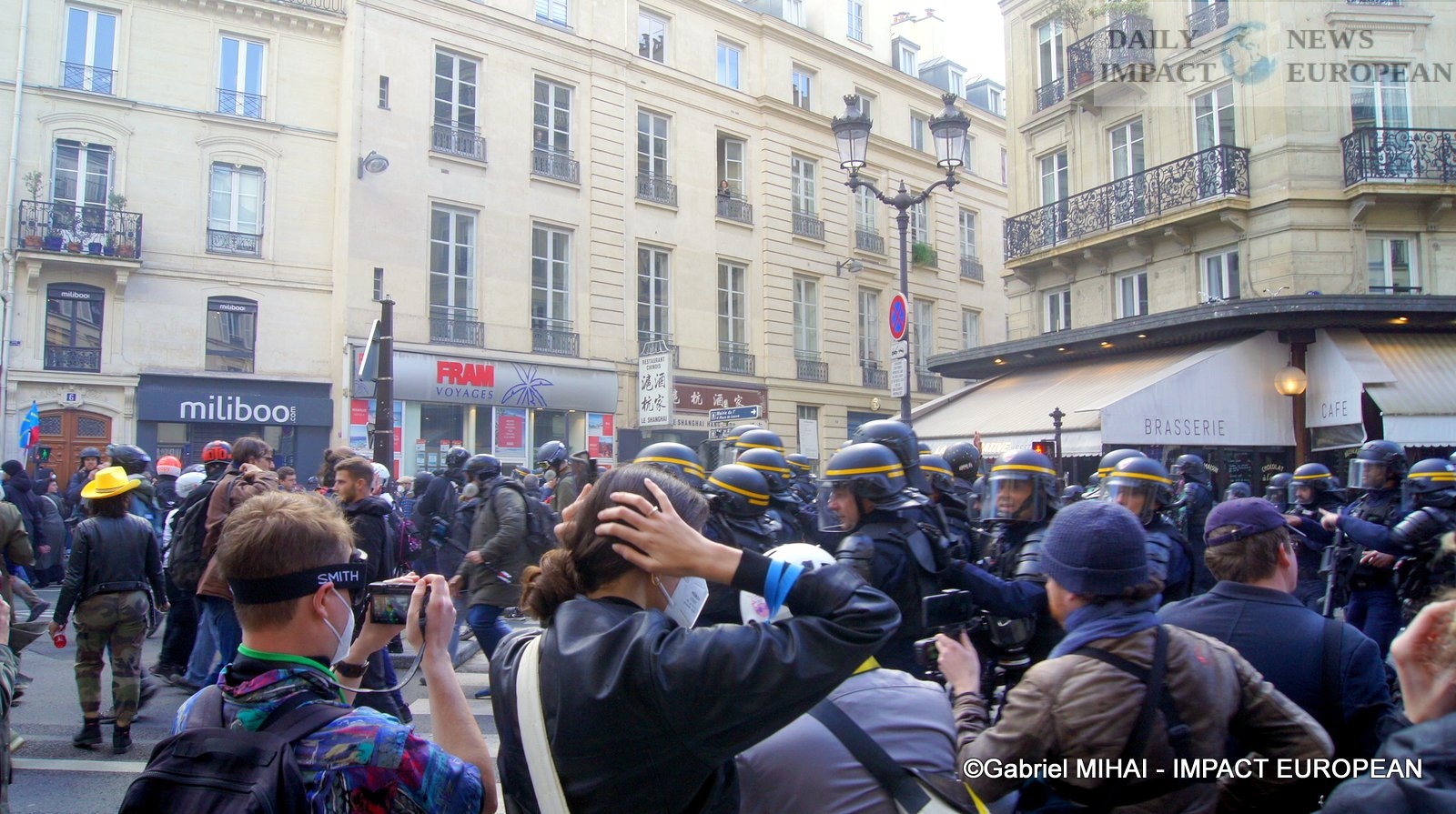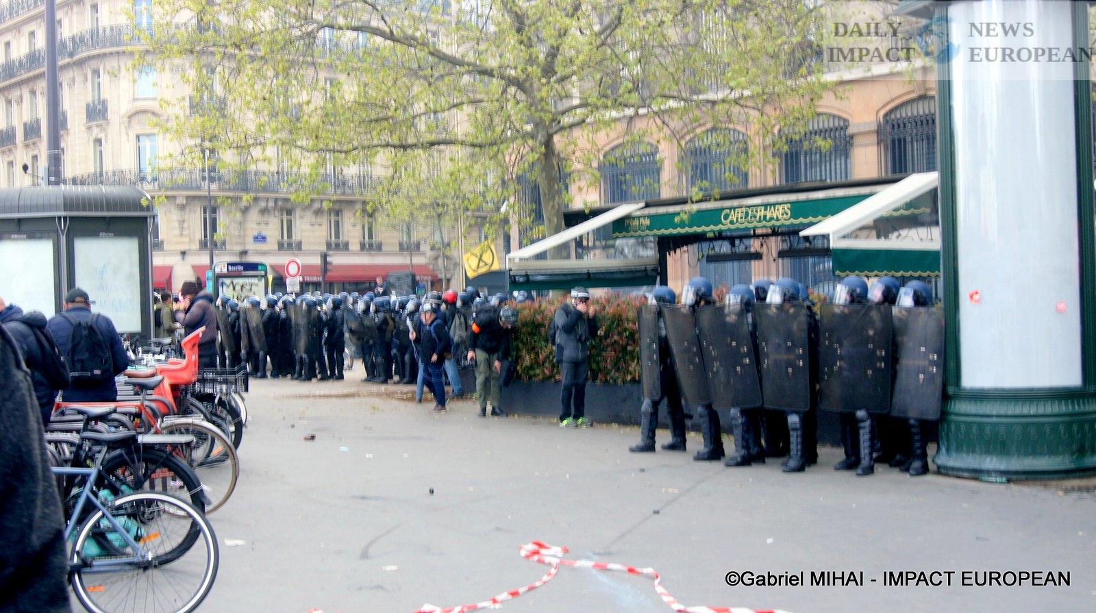 For 40 minutes, there were clashes between demonstrators and the police, place de la Bastille, where the flower vases in front of the French bank were destroyed as well as the newsstand. Bottles, rocks and hard objects were thrown at the police. At the same time, the security forces attacked the group of demonstrators arriving and forced them to stand in Place de la Bastille, beating them with truncheons for no reason.