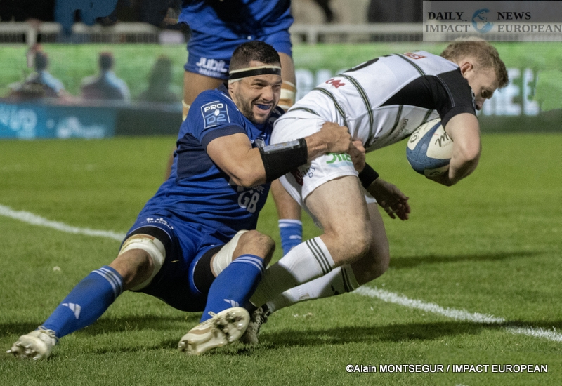 The defense made a series of mistakes and the referee did not hesitate to show the yellow card against Benjamin Boudou (11′). The sanction was immediate: touch at 5 meters, maul, pounding of the line and try for Anthony Coletta (7-0, 13′).