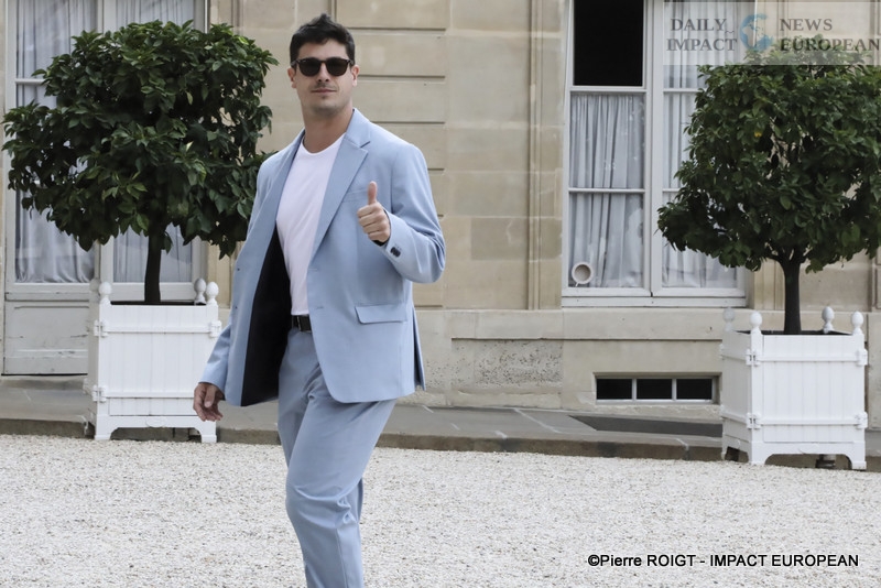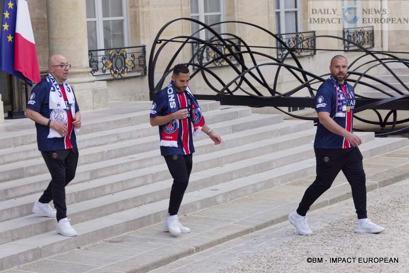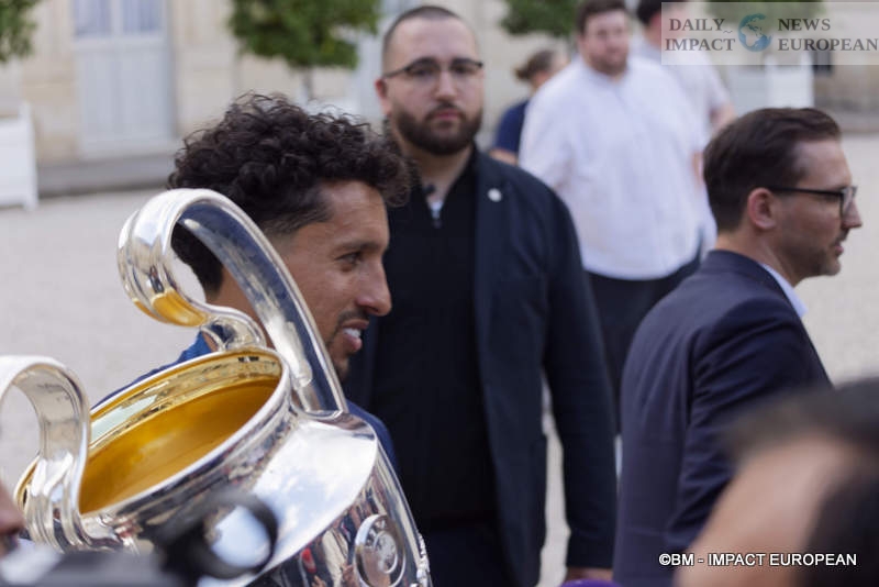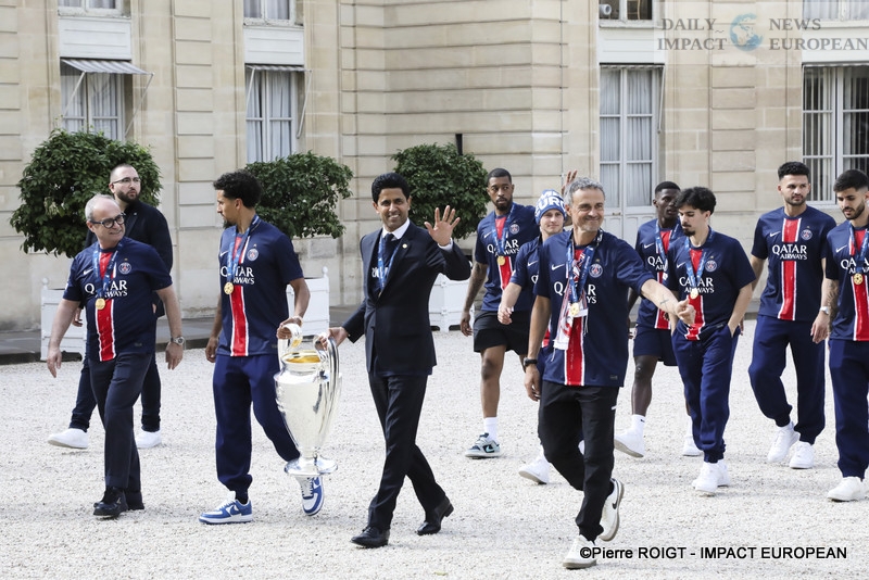 The new European champions arrived at the Élysée Palace at 6:30 p.m. for a meeting with French President Emmanuel Macron. Carrying the Champions League trophy, Marquinhos and Nasser al-Khelaïfi led the way into the courtyard.