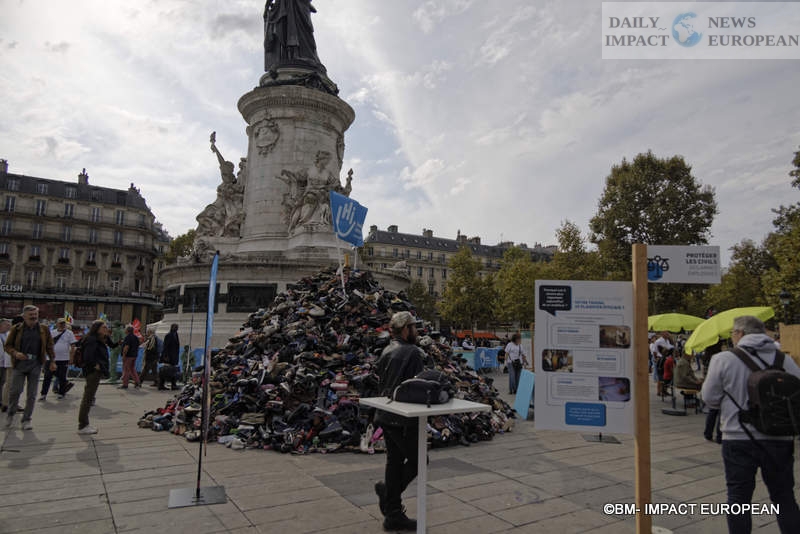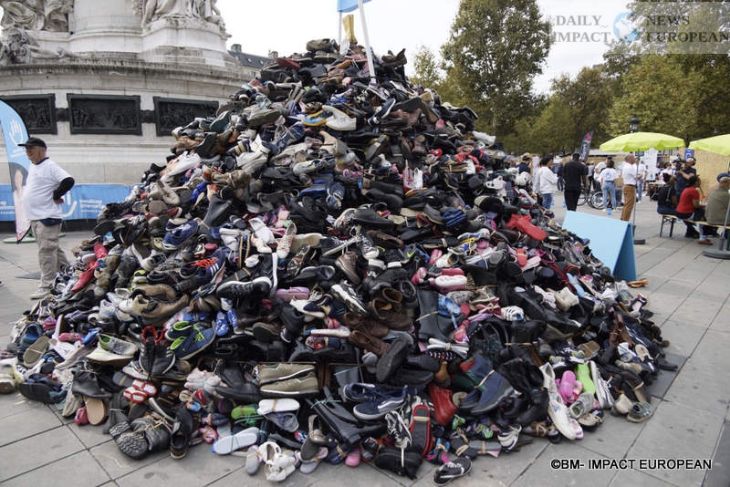 On Saturday, September 21, 2024, a real shoe pyramid took place at Place de La République, an initiative to protest against the use of explosive weapons.