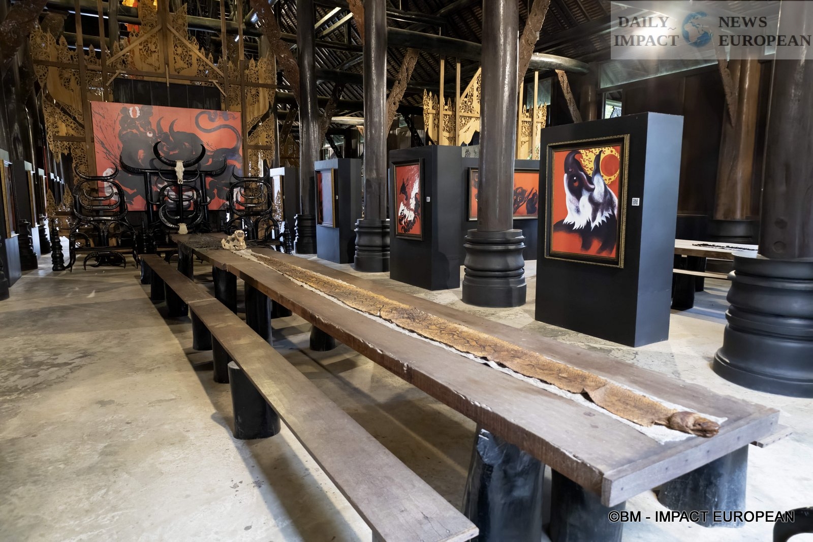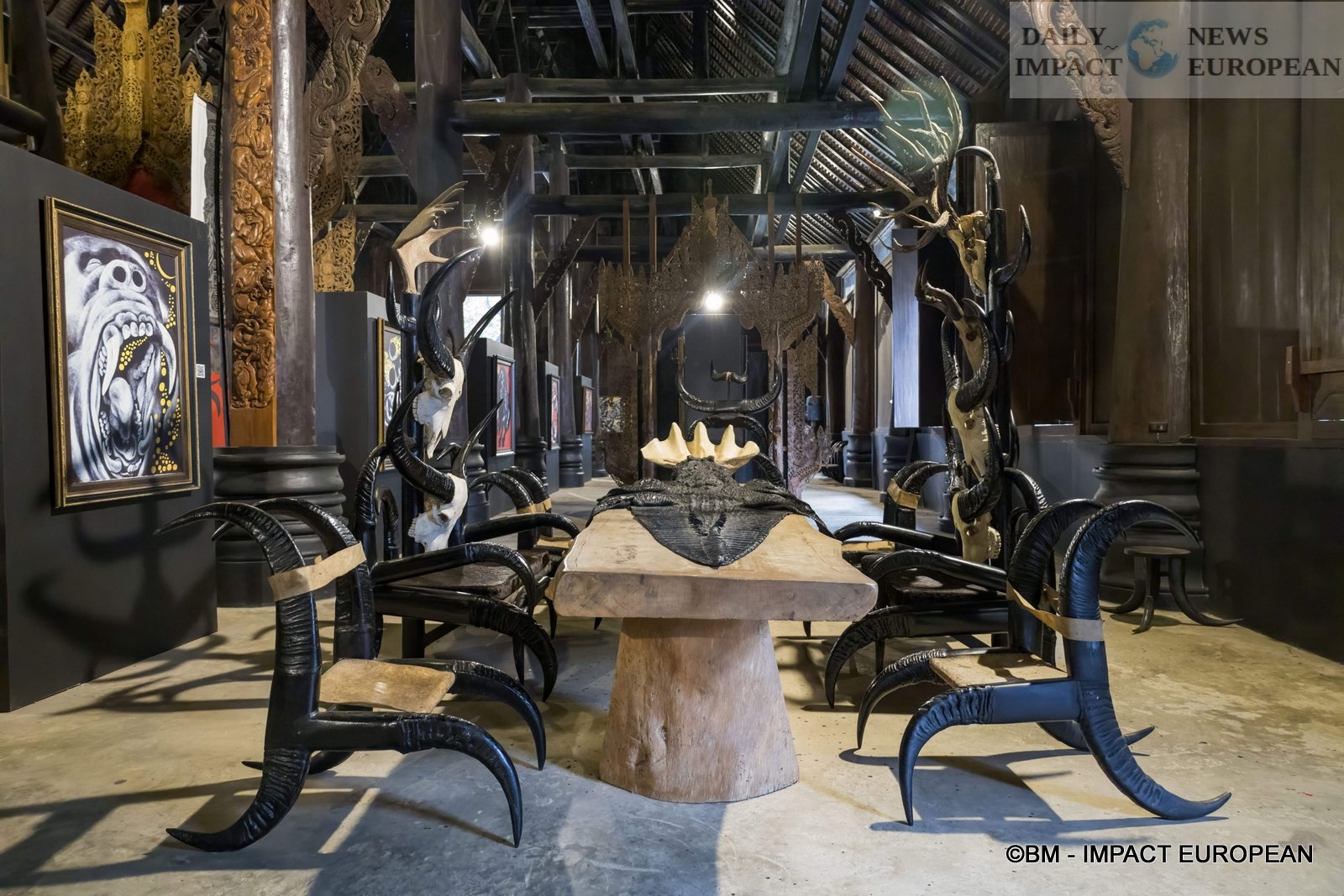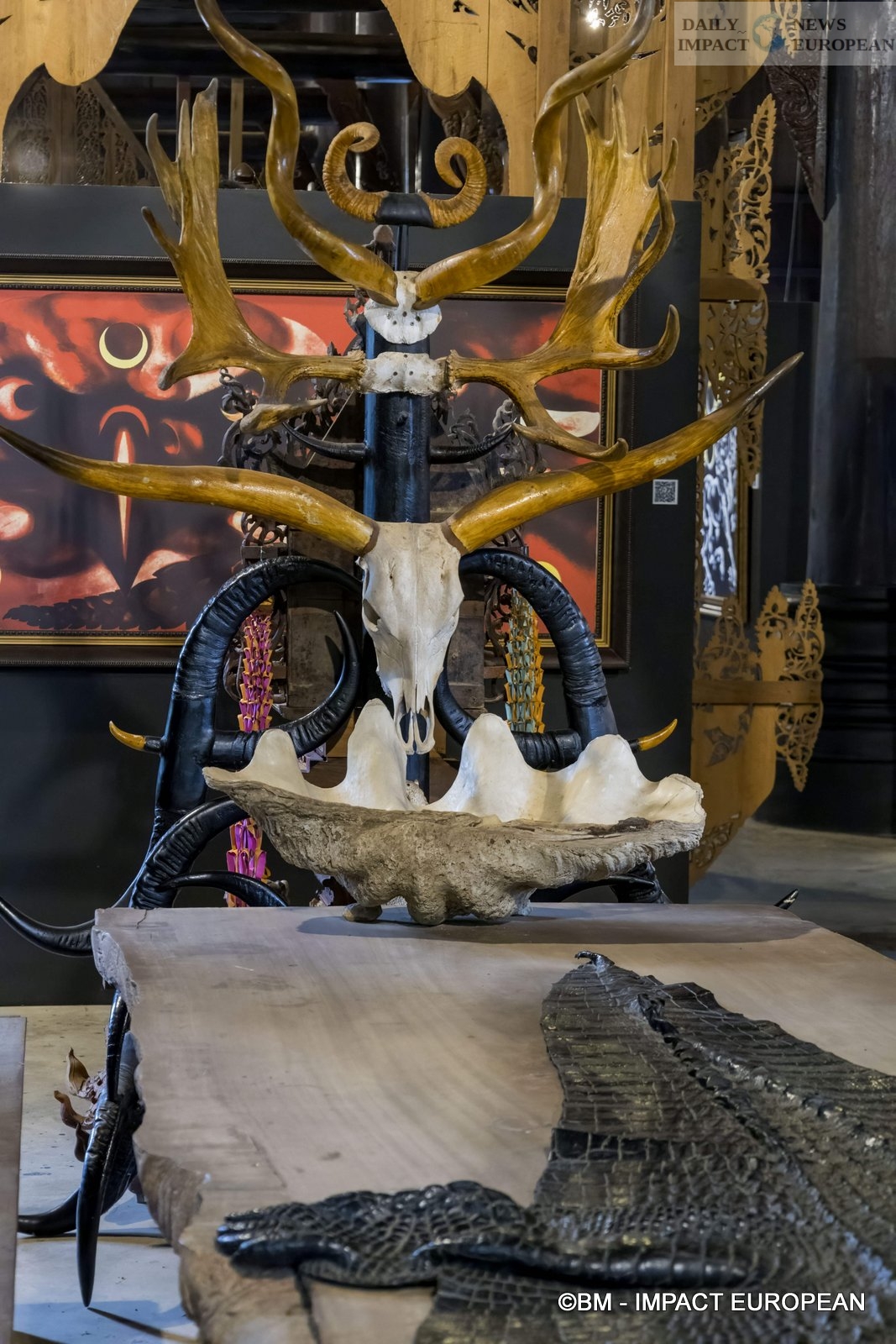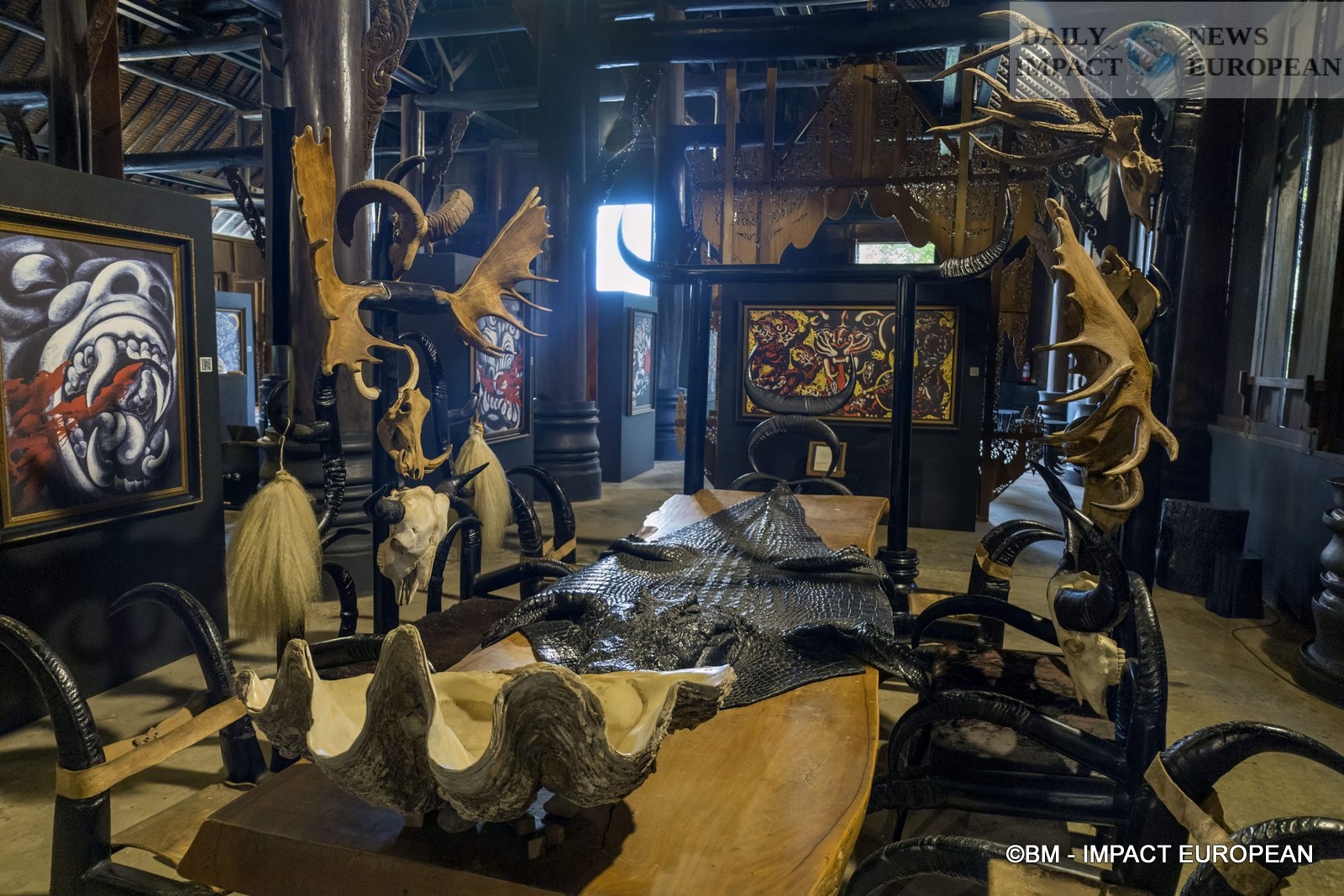 Inside, we discover the entrance with a huge wooden table covered with table runners in snake and crocodile skins. Black chairs are reminiscent of abused guests. Note also the omnipresence of animal skins, bones and horns in the paintings, sculptures and furniture, not to mention the large canvases painted in blood red with black brushstrokes.
