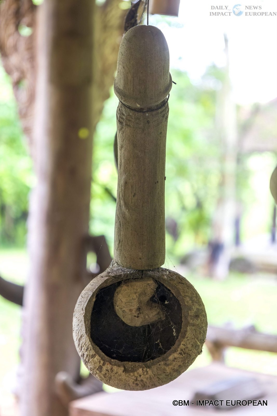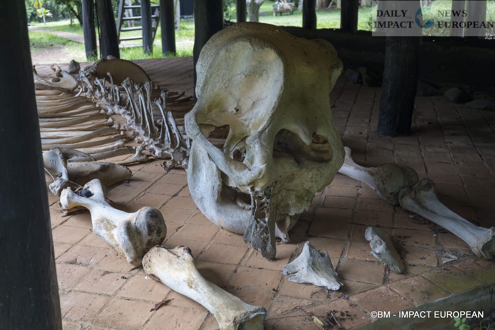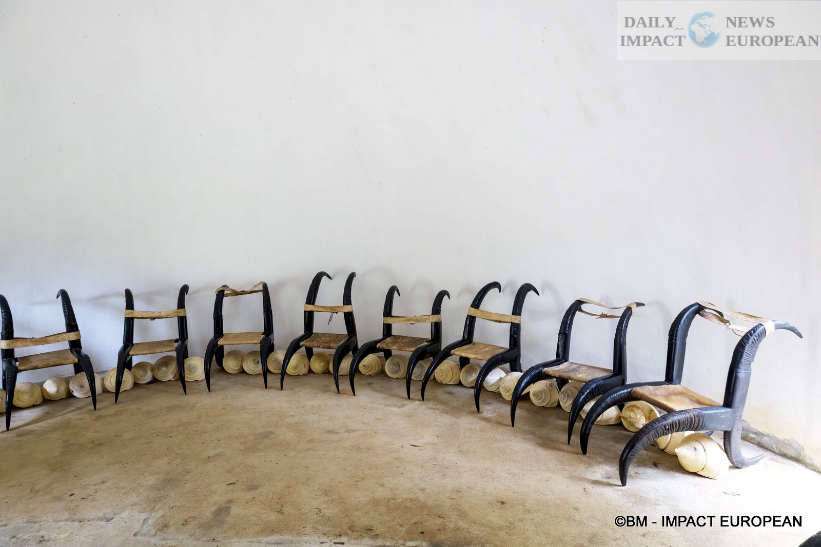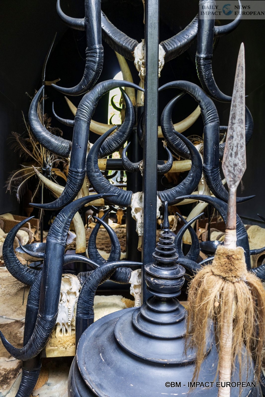Inside, we discover the entrance with a huge wooden table covered with table runners in snake and crocodile skins. Black chairs are reminiscent of abused guests. Note also the omnipresence of animal skins, bones and horns in the paintings, sculptures and furniture, not to mention the large canvases painted in blood red with black brushstrokes.
