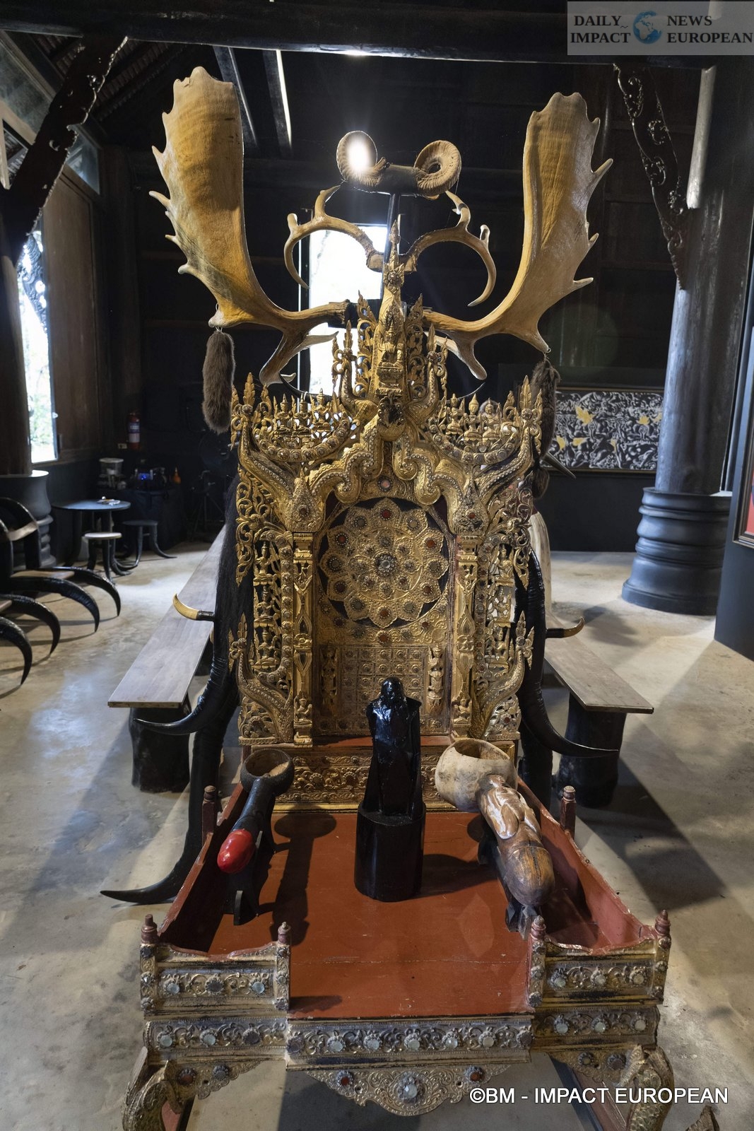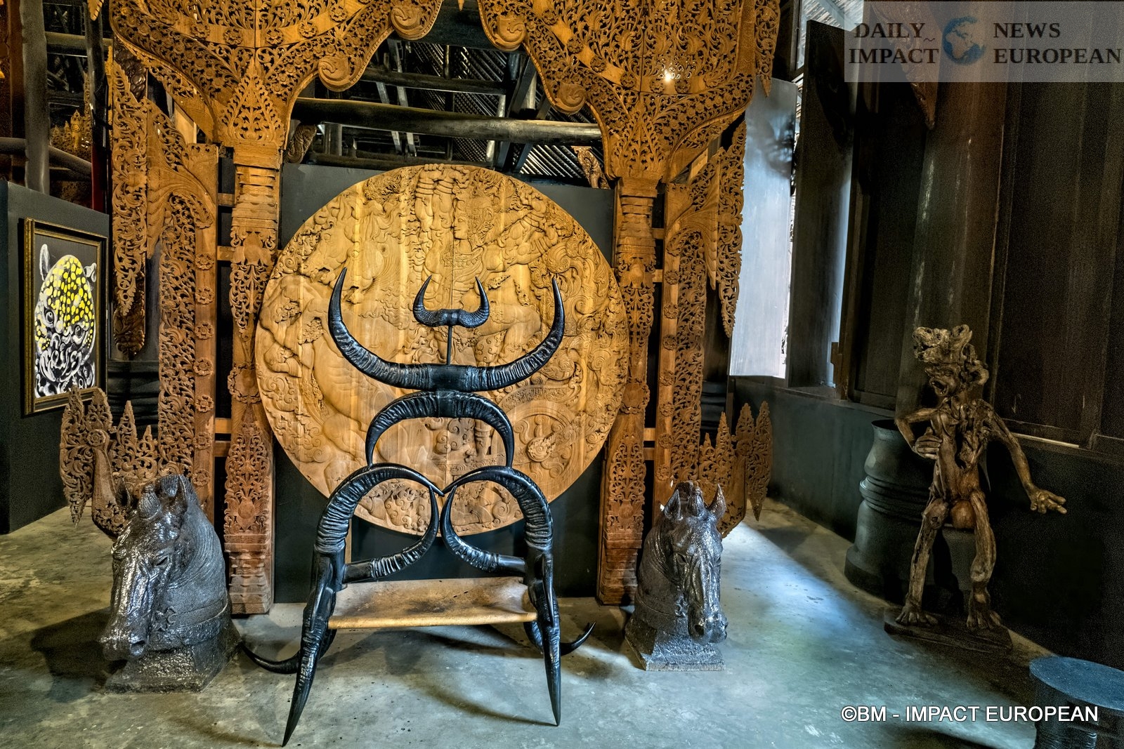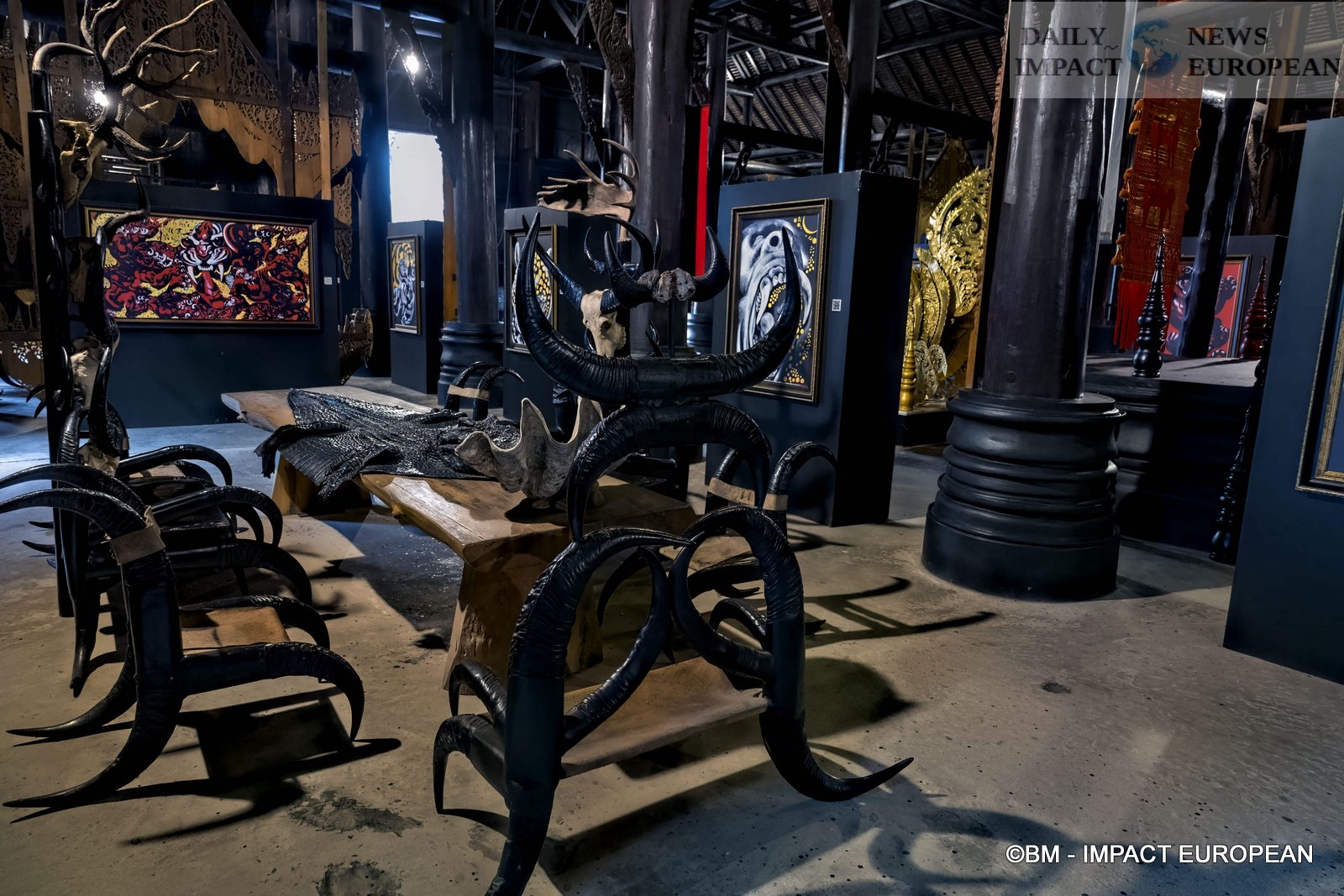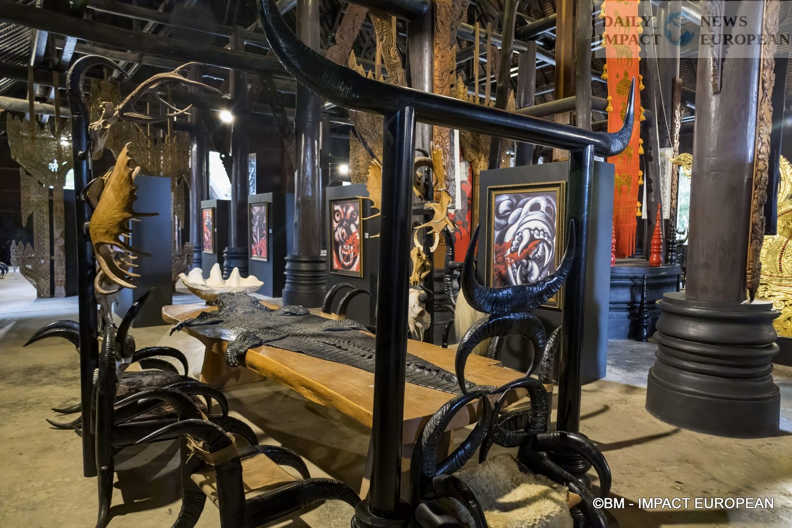 The building, also called « Black Temple » or « Temple of Hell », is more of a museum and an art workshop. Built with a mix of traditional Thai architecture and contemporary style, it looks like an ordinary temple at first glance. However, the interior gives off a dark and mysterious atmosphere, linked to the presence of stuffed animals transformed into furniture and artistic installations. The Black House is the world’s largest collection of animal remains. He is opposed to the White Temple, Wat Rong Khun, which is described as heavenly and which is called « Temple of Heaven ».