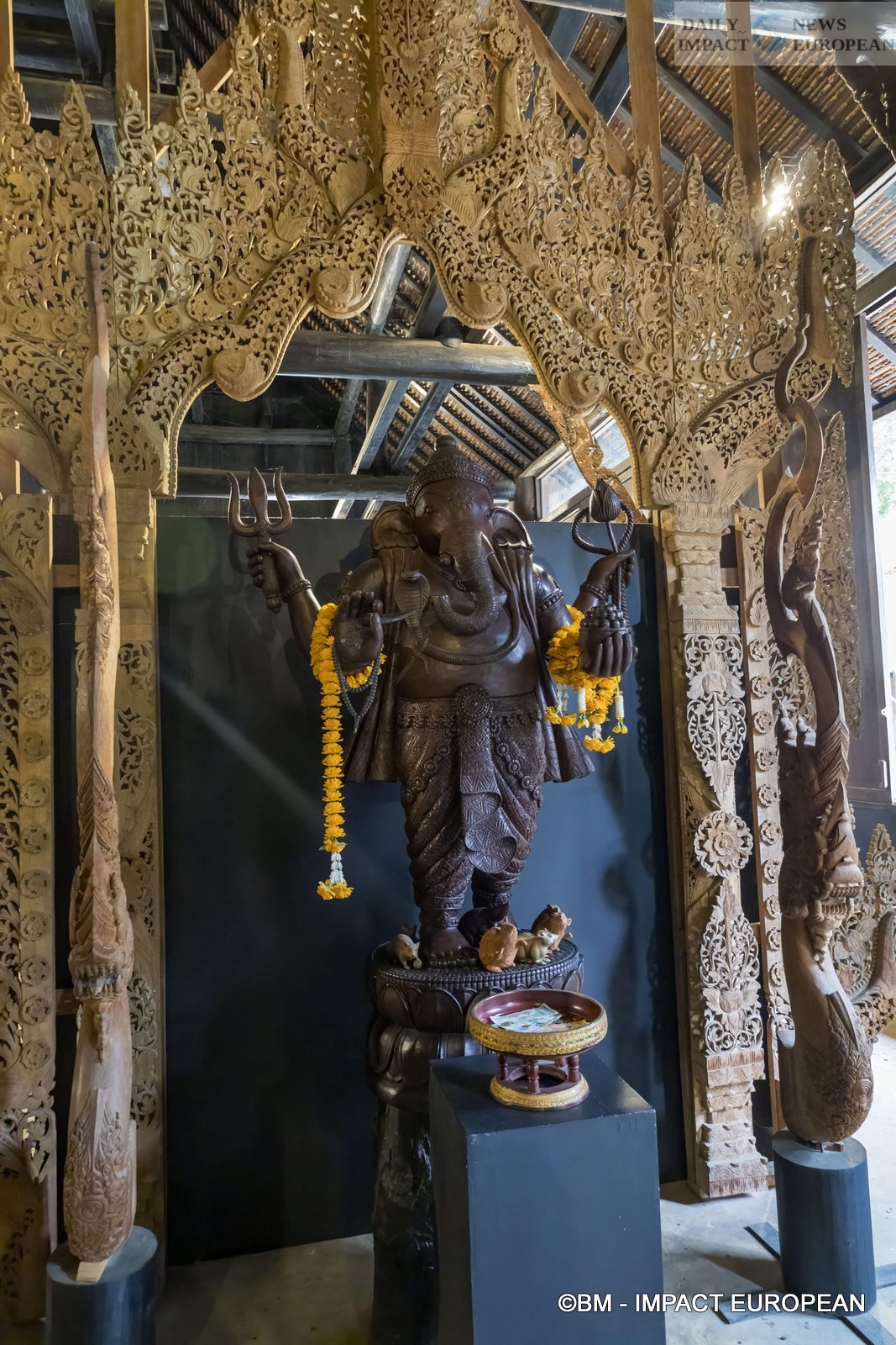 The « Cathedral » is the building of the art museum. Designed from 1999 to 2009, by Thawan Duchanee and Baan Dam engineers, it is made of wood and consists of 44 large pillars and stairs to the east and west. Sitting on a brick slab 2.80m above the ground, it has a 4-tier Lanna-style triangular roof and is covered with unglazed clay tiles and decorated in Thai and Lanna style like the swan’s tail.