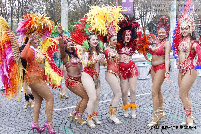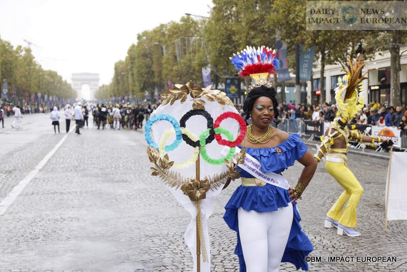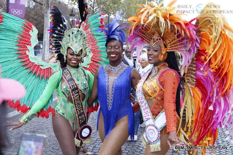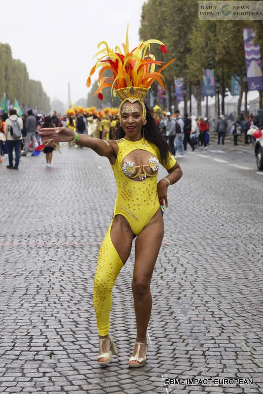 This year, the parade took place in the fall because of the Paris 2024 Olympic Games. Indeed, in other years, the city of Paris, in collaboration with the Paris Tropical Carnival Federation, chooses the first weekend of July to enchant Parisians and tourists with groups from all over France and the West Indies (Guadeloupe, Martinique, Reunion and Guyana). It is also an opportunity to highlight distant cultures from Asia or Latin America (Brazil, or Colombia…). For the 2024 edition, nearly 4,000 dancers in colorful and sequined costumes and a dozen floats were present on the most beautiful avenue in the world, to share this friendly and colorful event despite a few drops of rain. This year’s theme was « Overseas Territories United by the Olympics ». We could also notice the presence of overseas champions at the head of the procession, including fencers Enzo Lefort and Yannick Borel.
