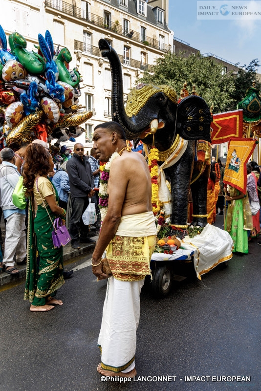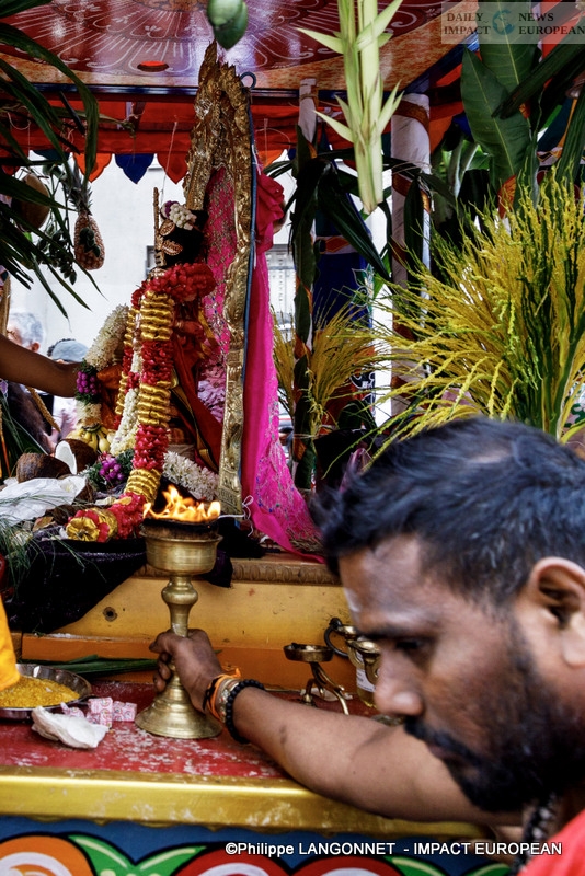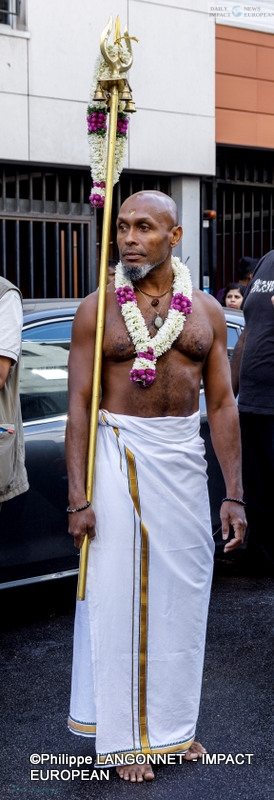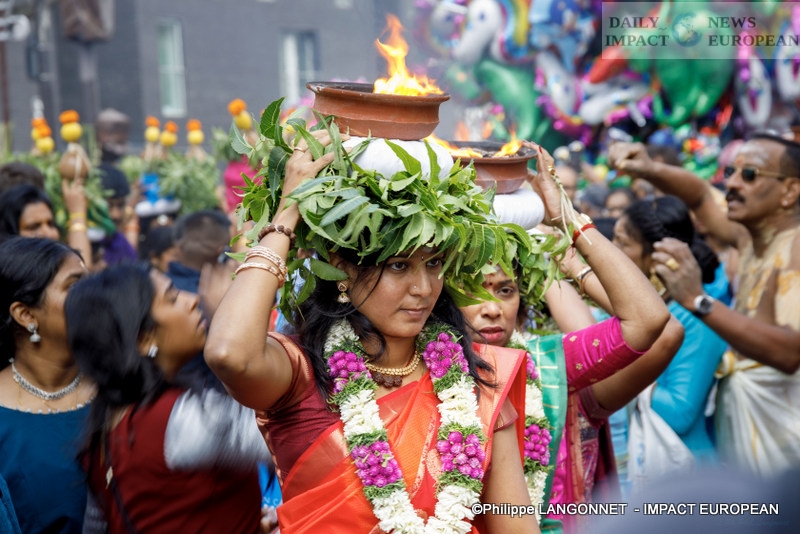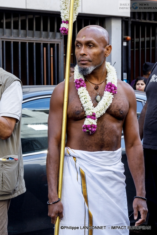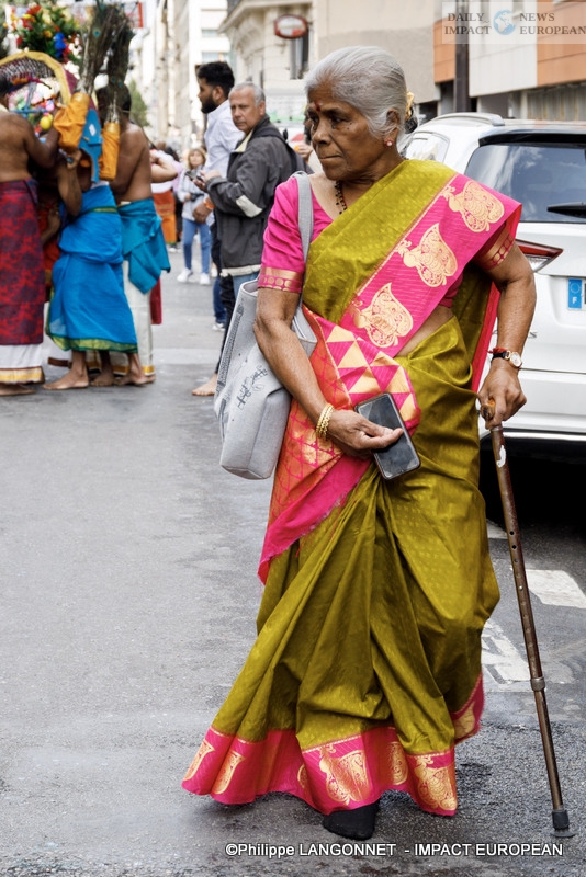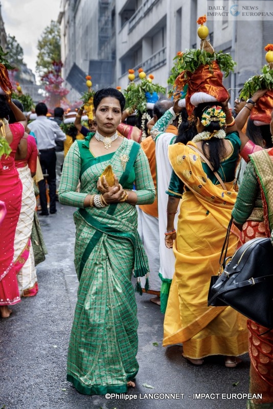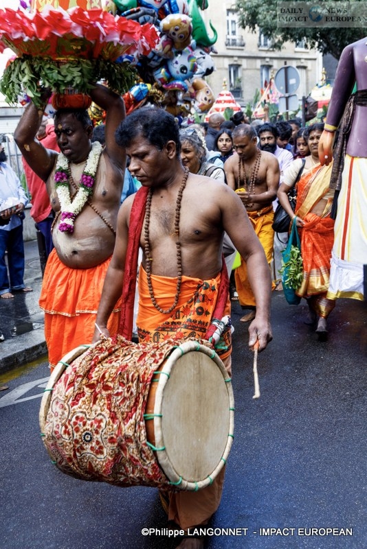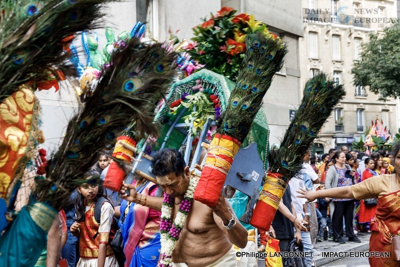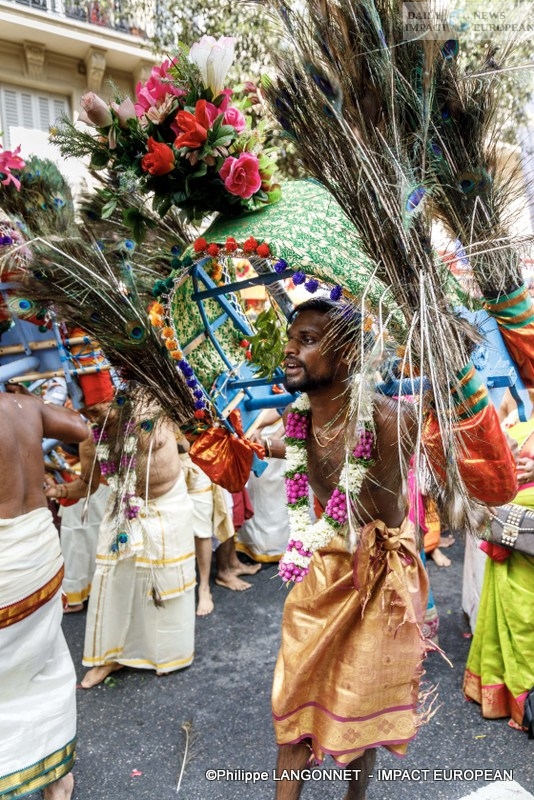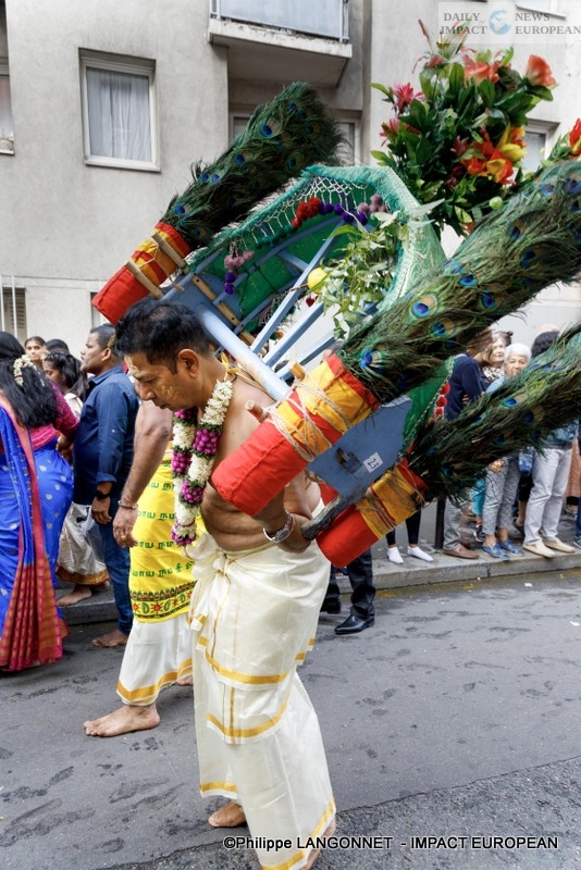 At 10:30 a.m., the procession left the Temple of Sri Manicka Vinayakar Alayam, 17 rue Pajol (75018) where the ceremonies began at 9 a.m. He walked the streets of the district (rue Pajol, rue du faubourg St Denis, rue Marx Dormoy and rue du Département) to the sound of drums, nagashvaram (a popular but rare wind instrument in Carnatic music, classical music from India of the South) and flutes. Male and female dancers, dressed in shimmering saris and suits, carried the traditional kavadi (wooden arch decorated with peacock feathers) on their shoulders. The lead dancers carried earthenware pots on their heads, in which burned camphor, known for its purifying power.