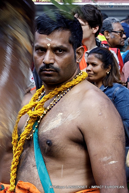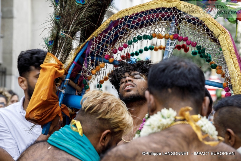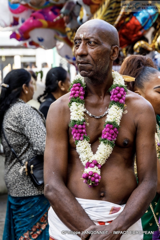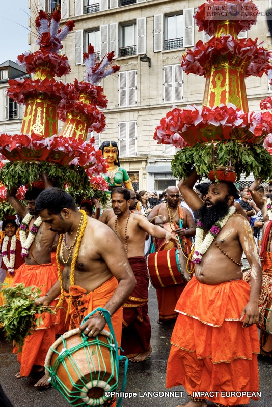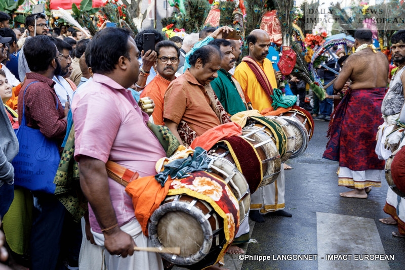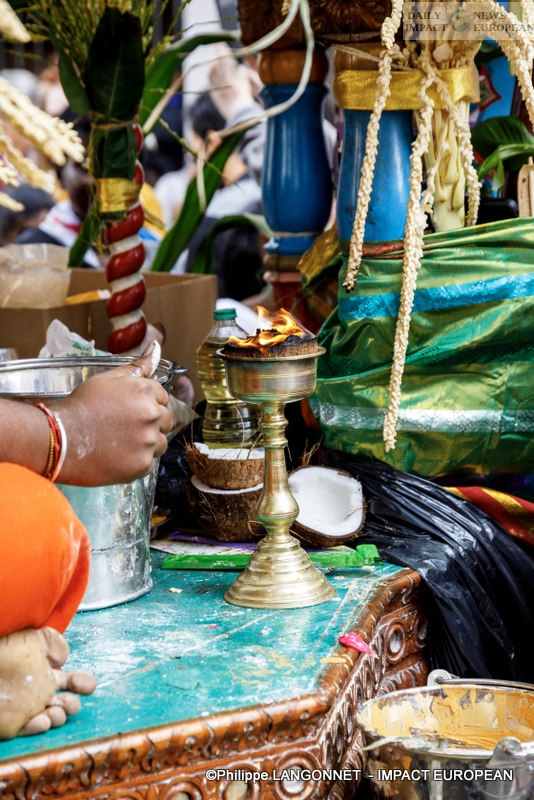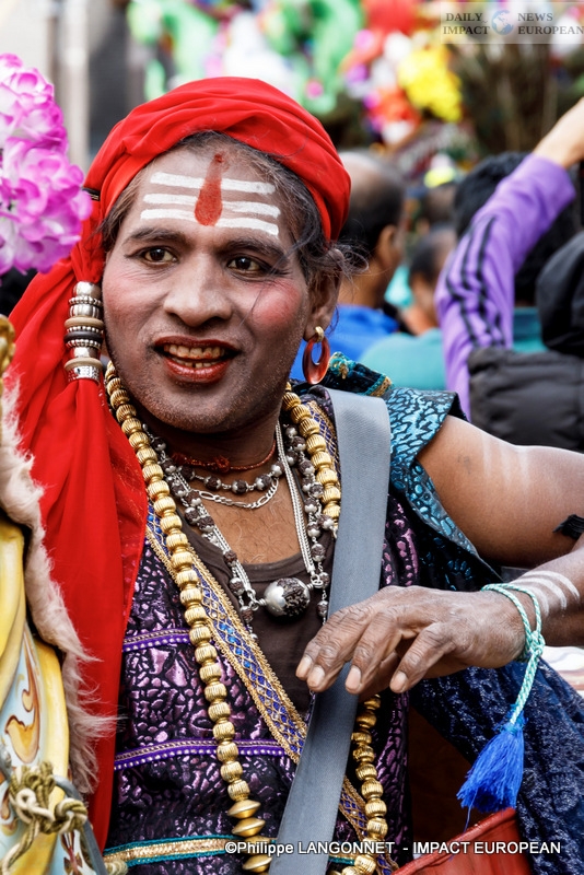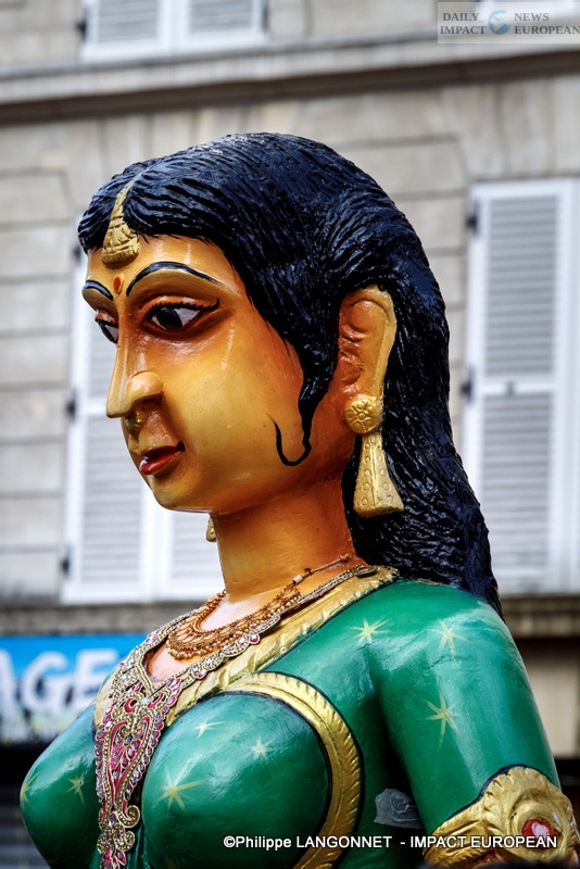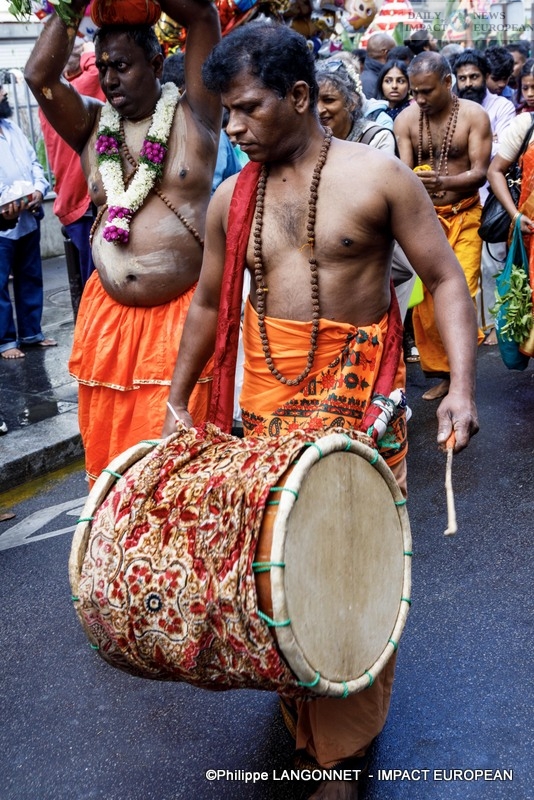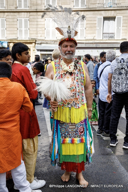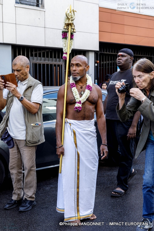 At 10:30 a.m., the procession left the Temple of Sri Manicka Vinayakar Alayam, 17 rue Pajol (75018) where the ceremonies began at 9 a.m. He walked the streets of the district (rue Pajol, rue du faubourg St Denis, rue Marx Dormoy and rue du Département) to the sound of drums, nagashvaram (a popular but rare wind instrument in Carnatic music, classical music from India of the South) and flutes. Male and female dancers, dressed in shimmering saris and suits, carried the traditional kavadi (wooden arch decorated with peacock feathers) on their shoulders. The lead dancers carried earthenware pots on their heads, in which burned camphor, known for its purifying power.