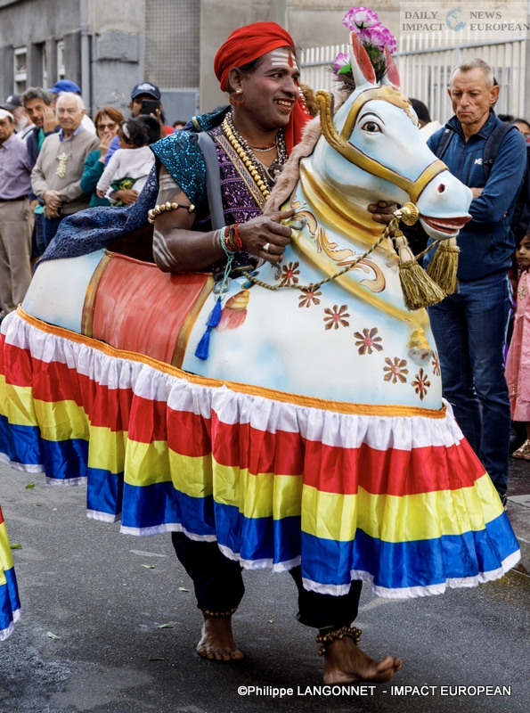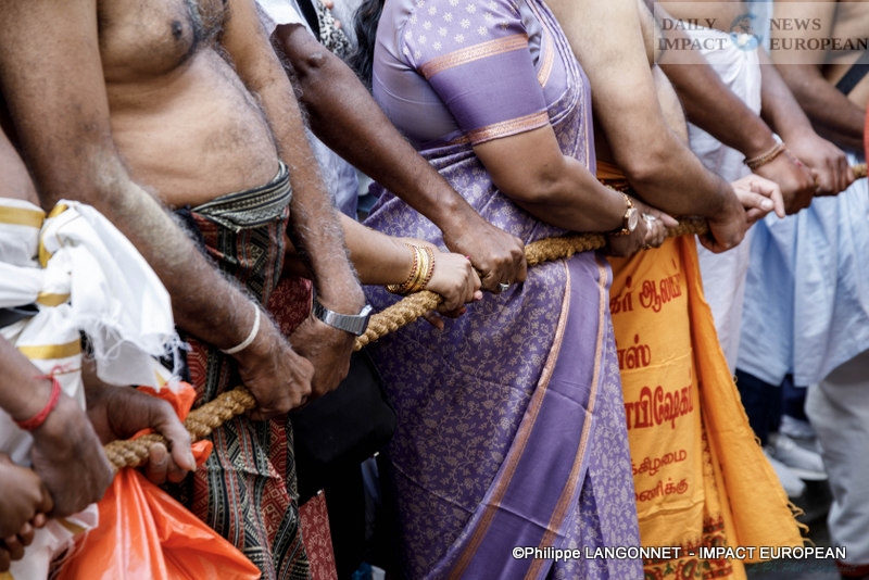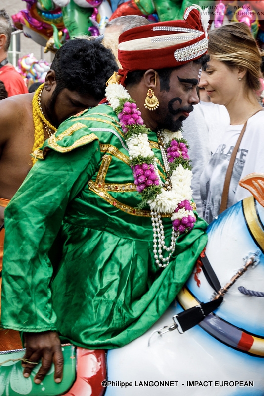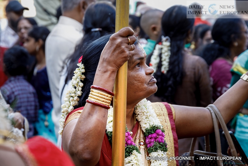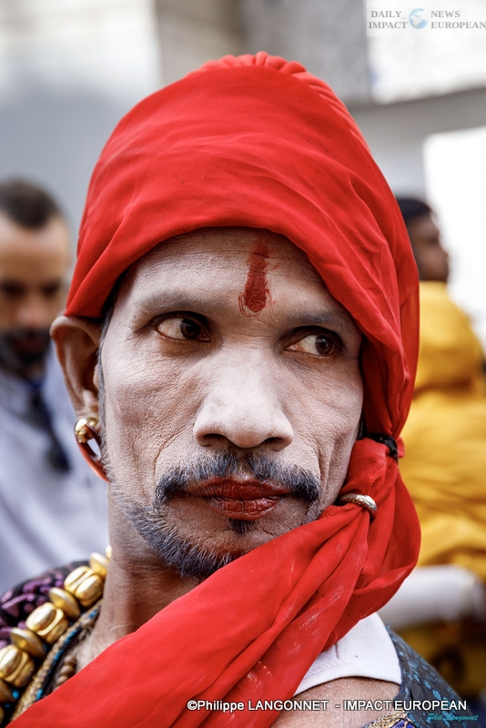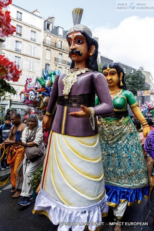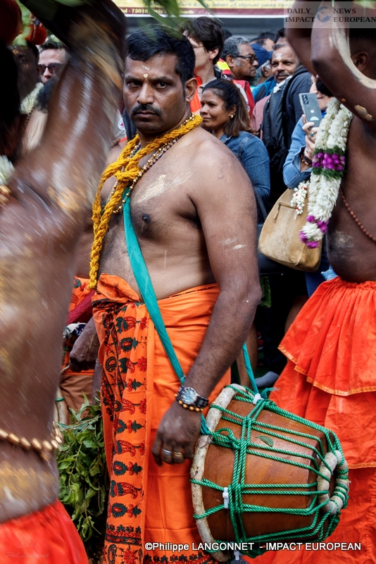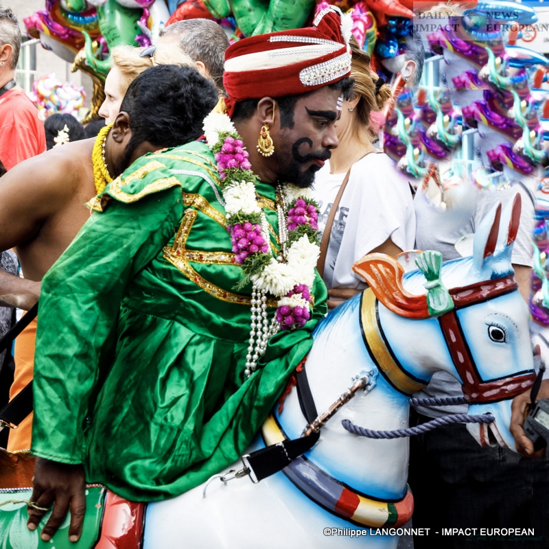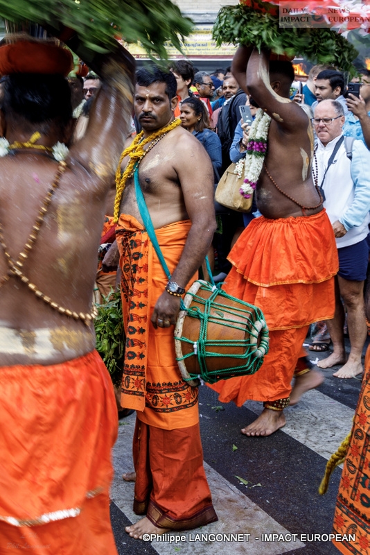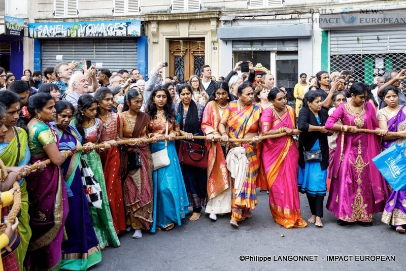 At 10:30 a.m., the procession left the Temple of Sri Manicka Vinayakar Alayam, 17 rue Pajol (75018) where the ceremonies began at 9 a.m. He walked the streets of the district (rue Pajol, rue du faubourg St Denis, rue Marx Dormoy and rue du Département) to the sound of drums, nagashvaram (a popular but rare wind instrument in Carnatic music, classical music from India of the South) and flutes. Male and female dancers, dressed in shimmering saris and suits, carried the traditional kavadi (wooden arch decorated with peacock feathers) on their shoulders. The lead dancers carried earthenware pots on their heads, in which burned camphor, known for its purifying power.