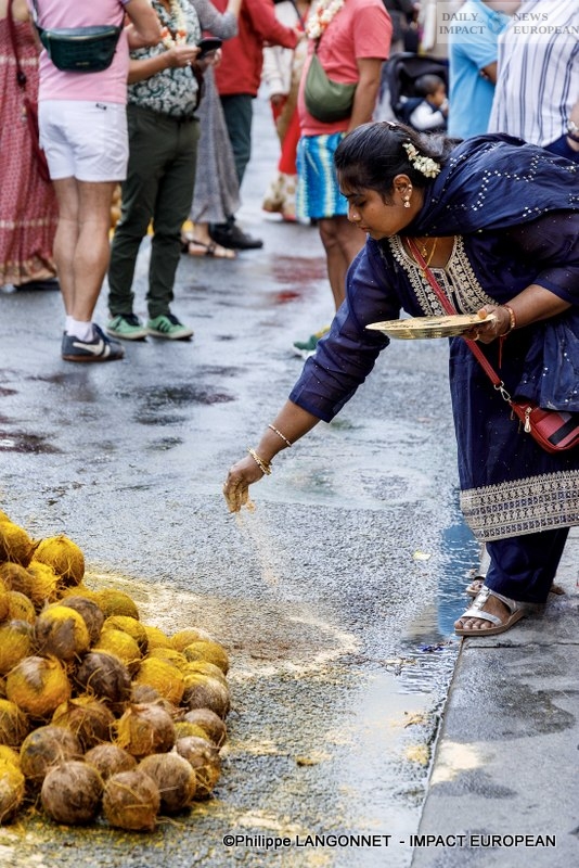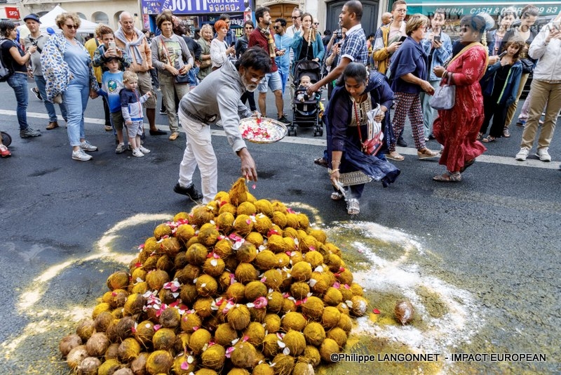 The ritual of the coconut, a sacred fruit in Indian culture, brings good luck and prosperity and takes place throughout the parade. The fruit is broken to free itself from its ego, in order to give way to its deep nature.
