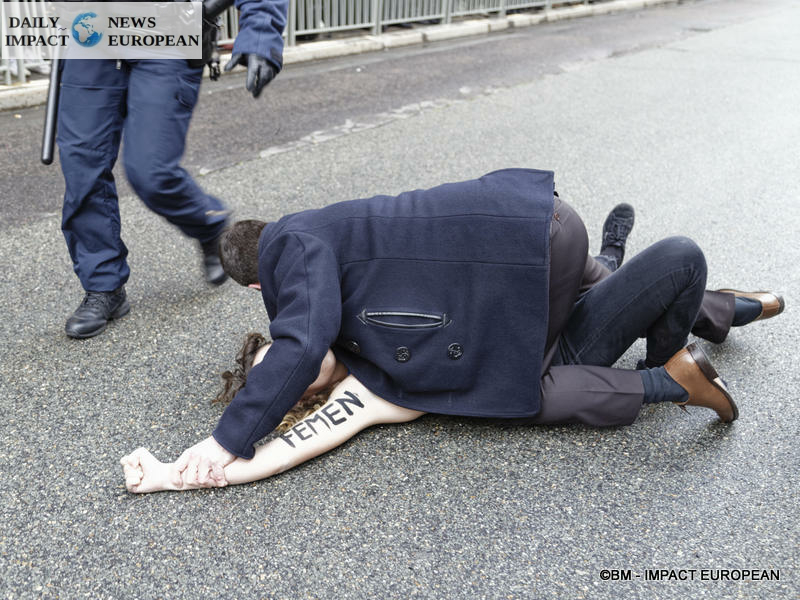 Before the meeting, opponents of the application of the Minsk agreements demonstrated in Kiev and Ukrainian expatriates in France demonstrated in Paris on December 8 in Place St Michel against Russia. Before the arrival of the participants, 2 FEMEN succeeded in breaking through the barriers and protested topless while chanting « Stop Putin’s war » before being arrested.