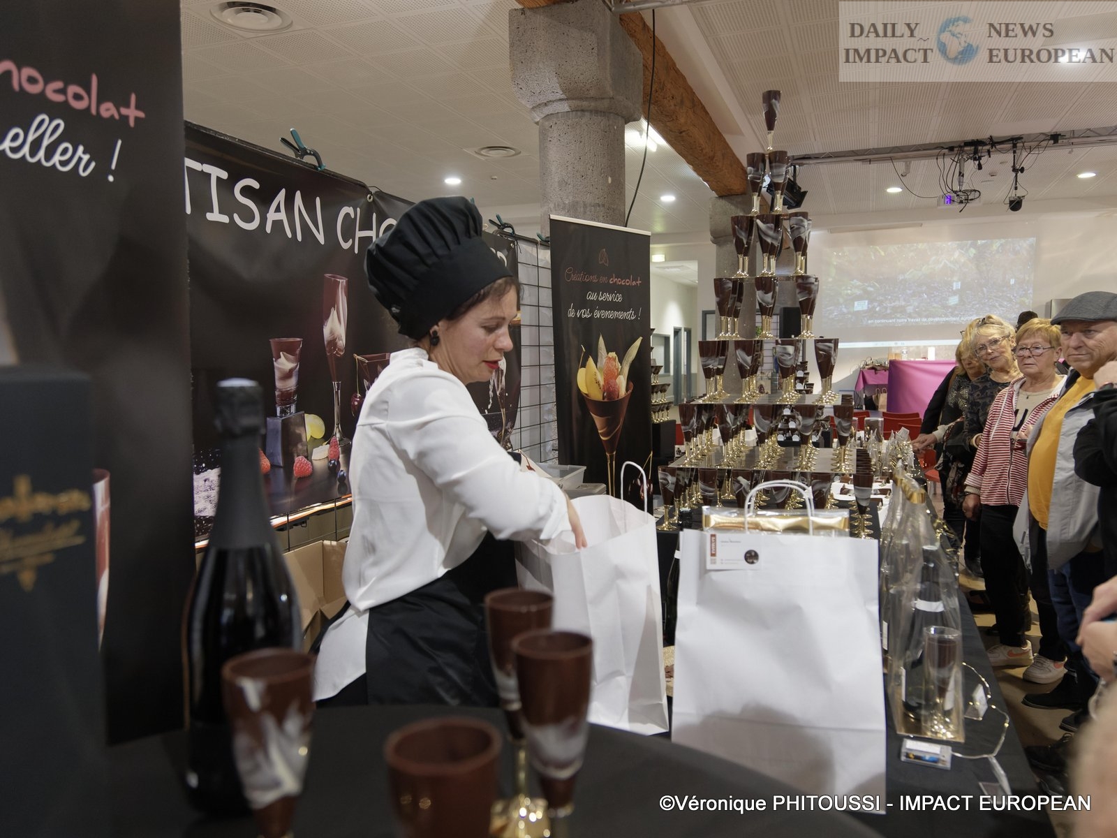 A stand offered chocolate champagne glasses. A funny aperitif stand offered various and varied rums and alcohols.
