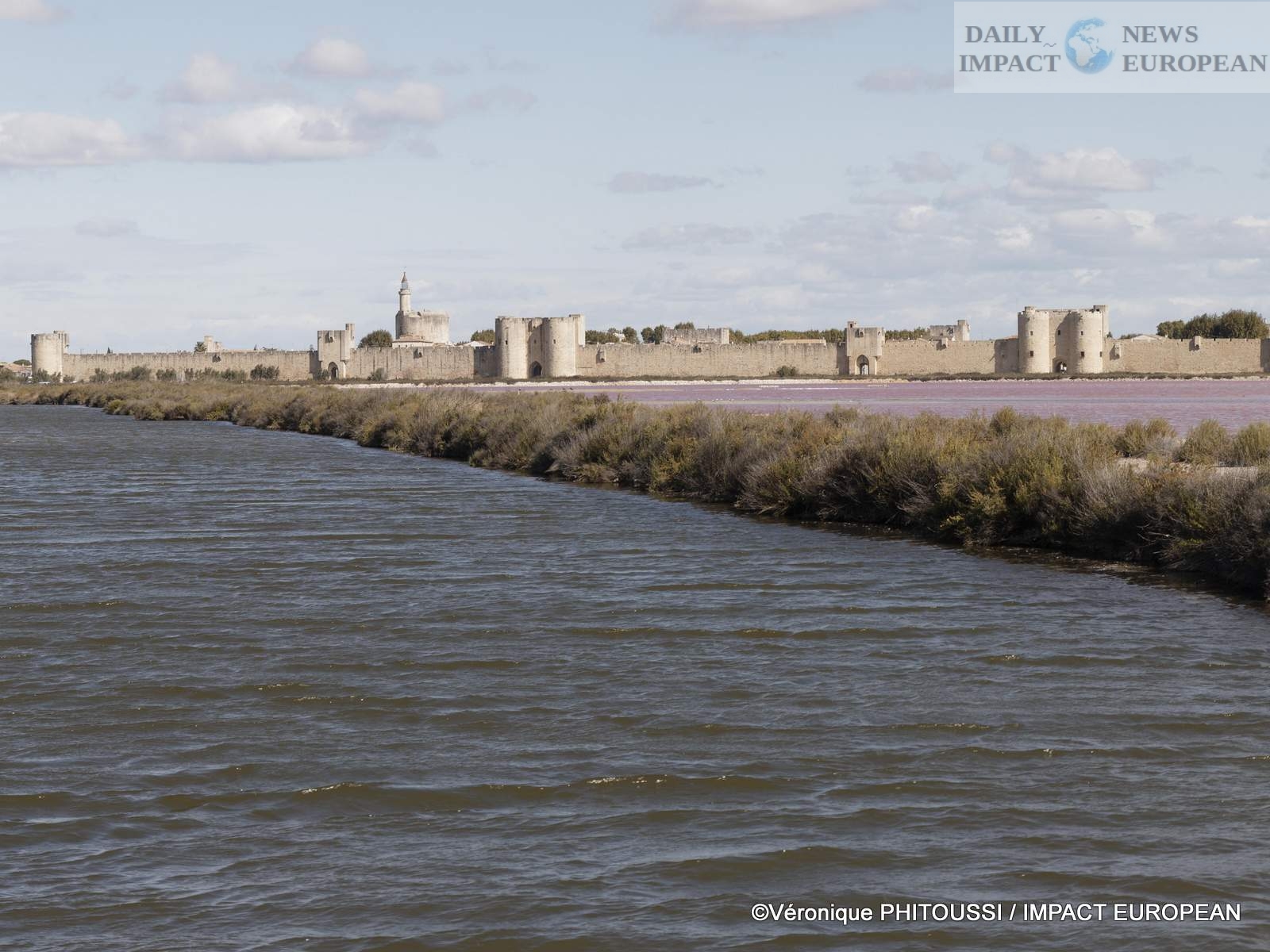 The Salin d’Aigues-Mortes in the Camargue is the largest salt production site in the Mediterranean. The saline represents approximately 10,000 hectares. It stretches 18 km from north to south and 13.5 km from east to west. 7,000 hectares are devoted to the cultivation of salt, including 420 to salt tables. The salt marshes cover a large part of the Peccais Marshes, to the south-east of the fortified village. Flamingos and swans live by the lake.